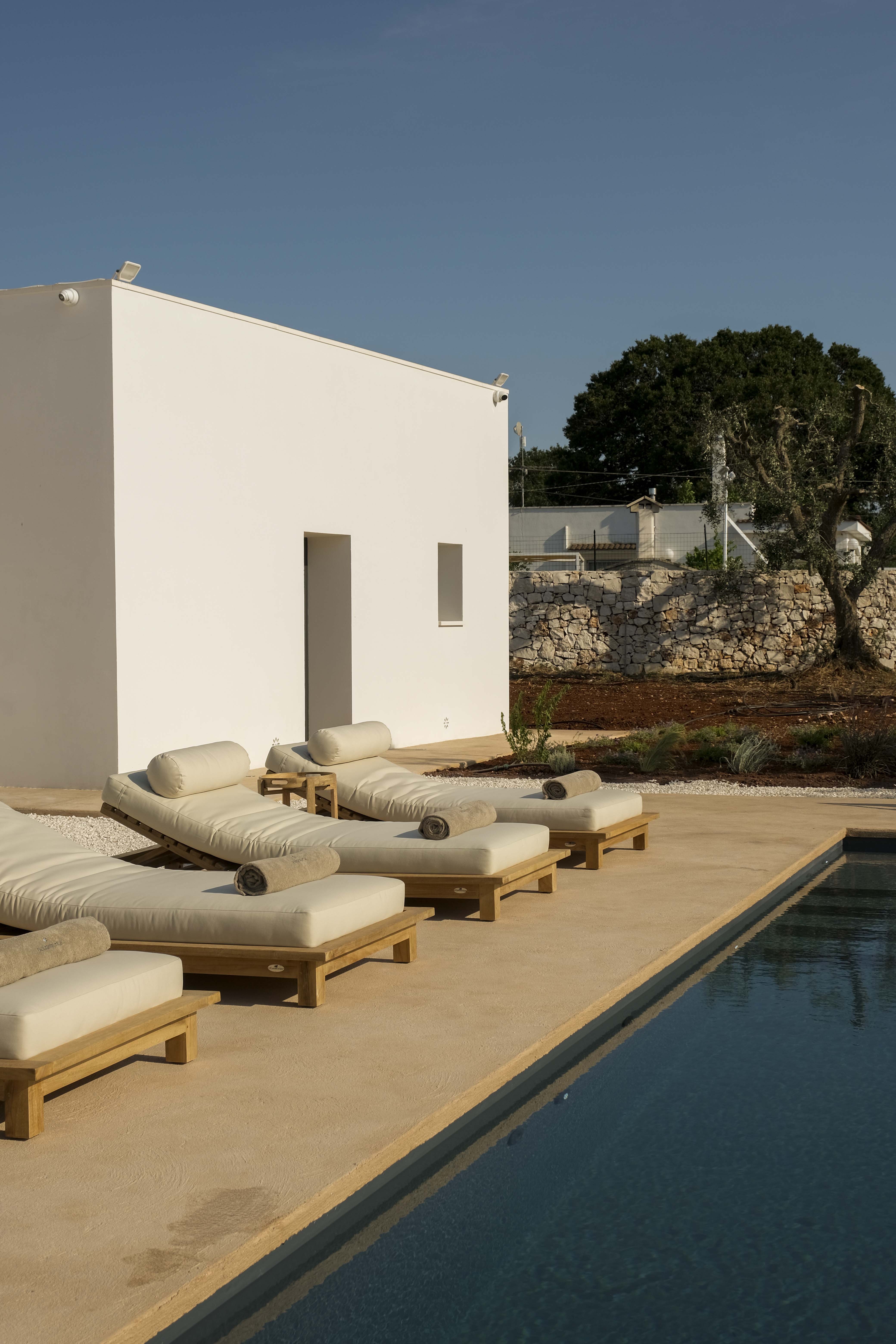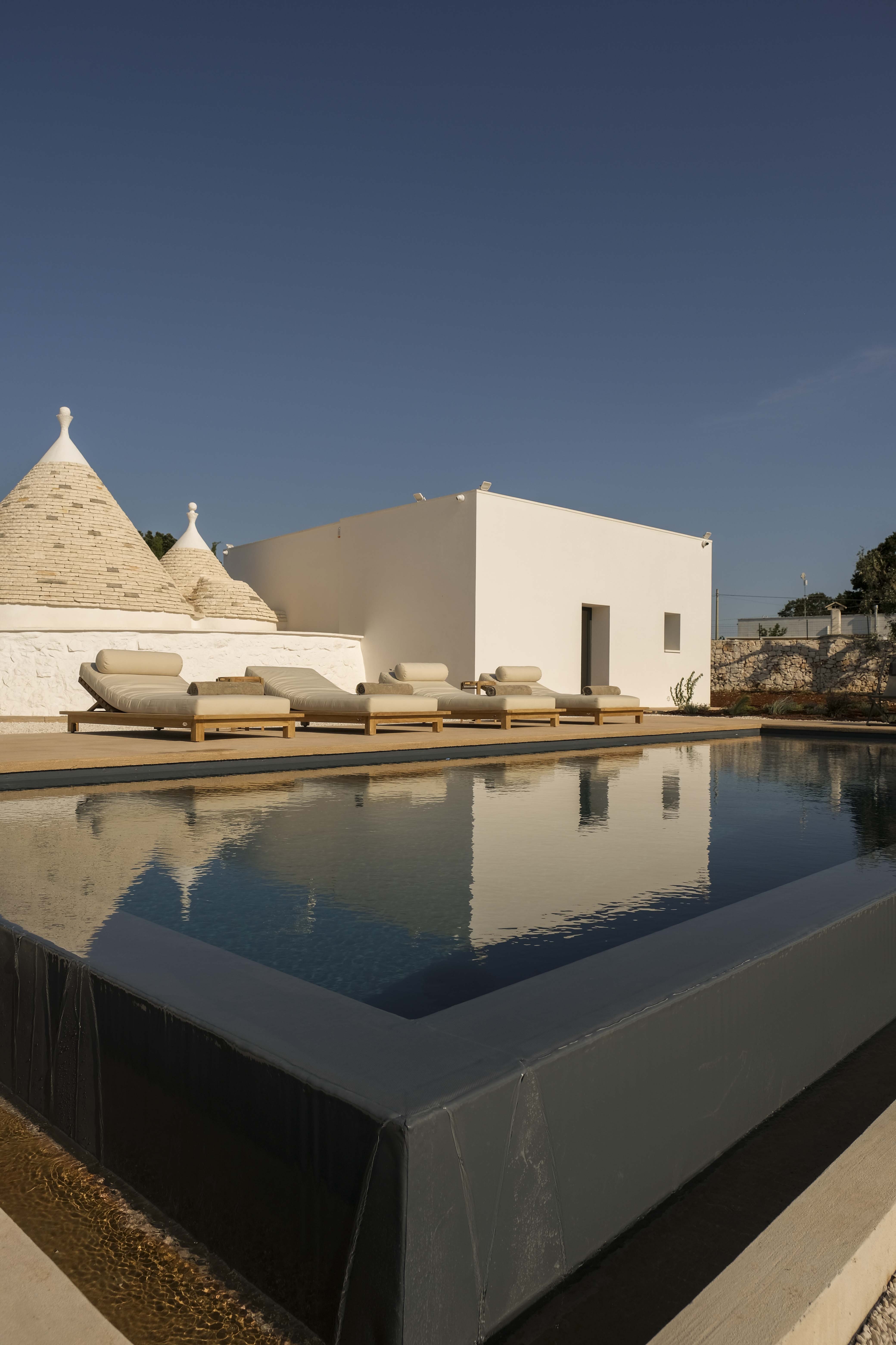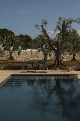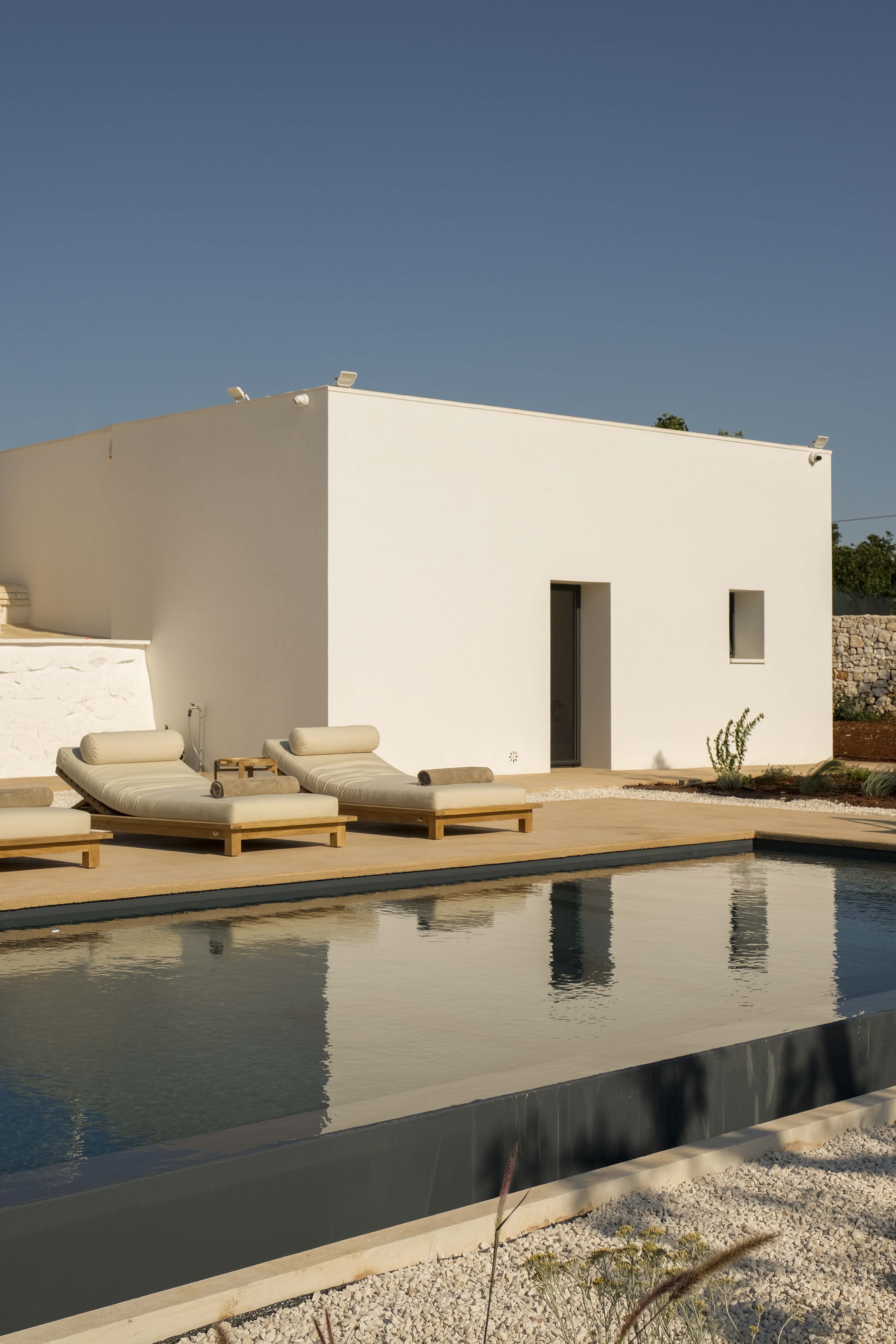 Piscina privata riscaldata, perfetta per godersi un bagno in ogni stagione grazie al clima mite della Puglia, con zona solarium attrezzata con lettini e sdraio