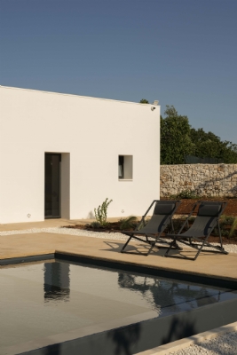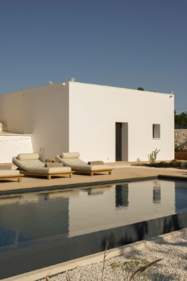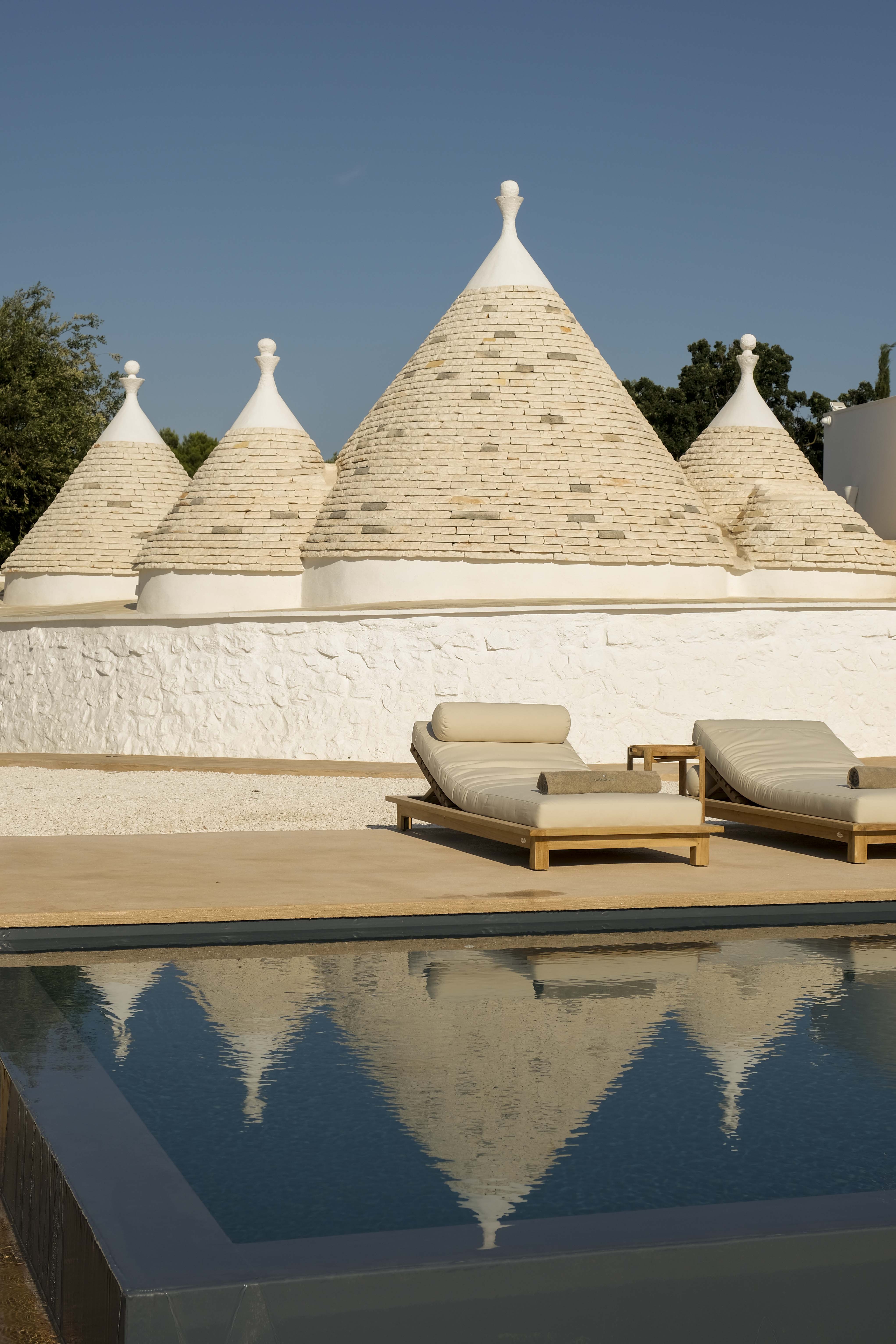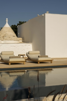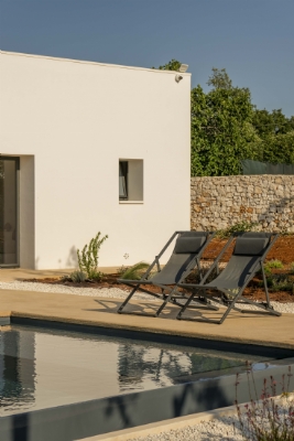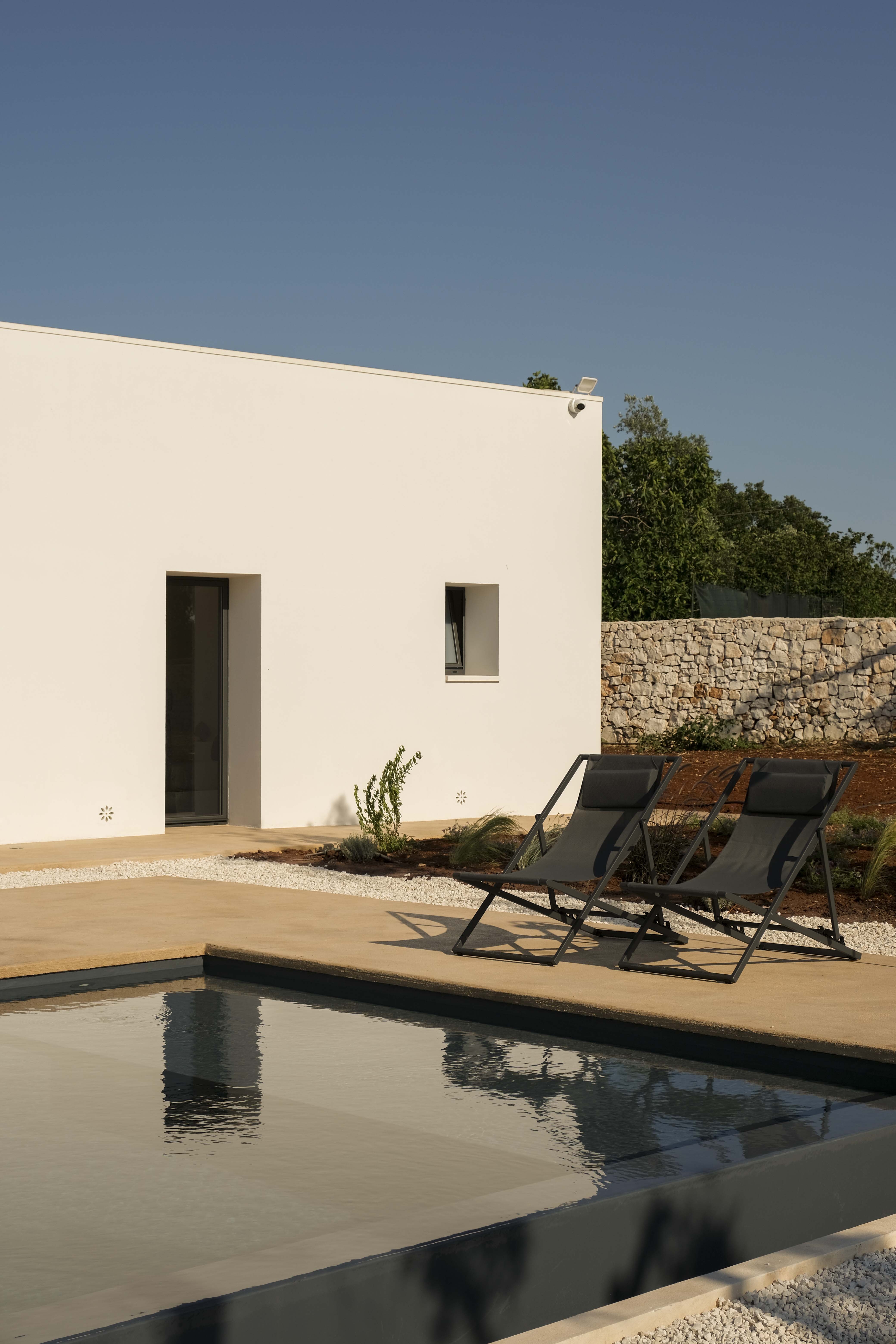 Piscina privata riscaldata, perfetta per godersi un bagno in ogni stagione grazie al clima mite della Puglia, con zona solarium attrezzata con lettini e sdraio