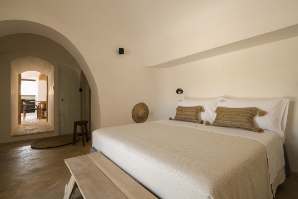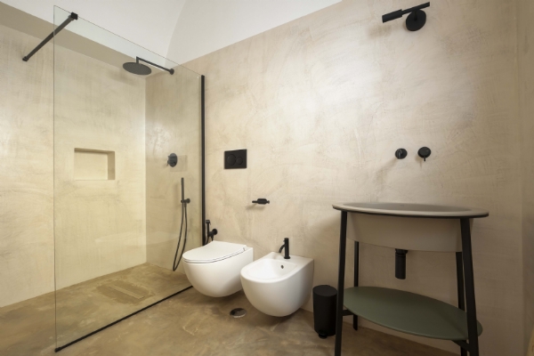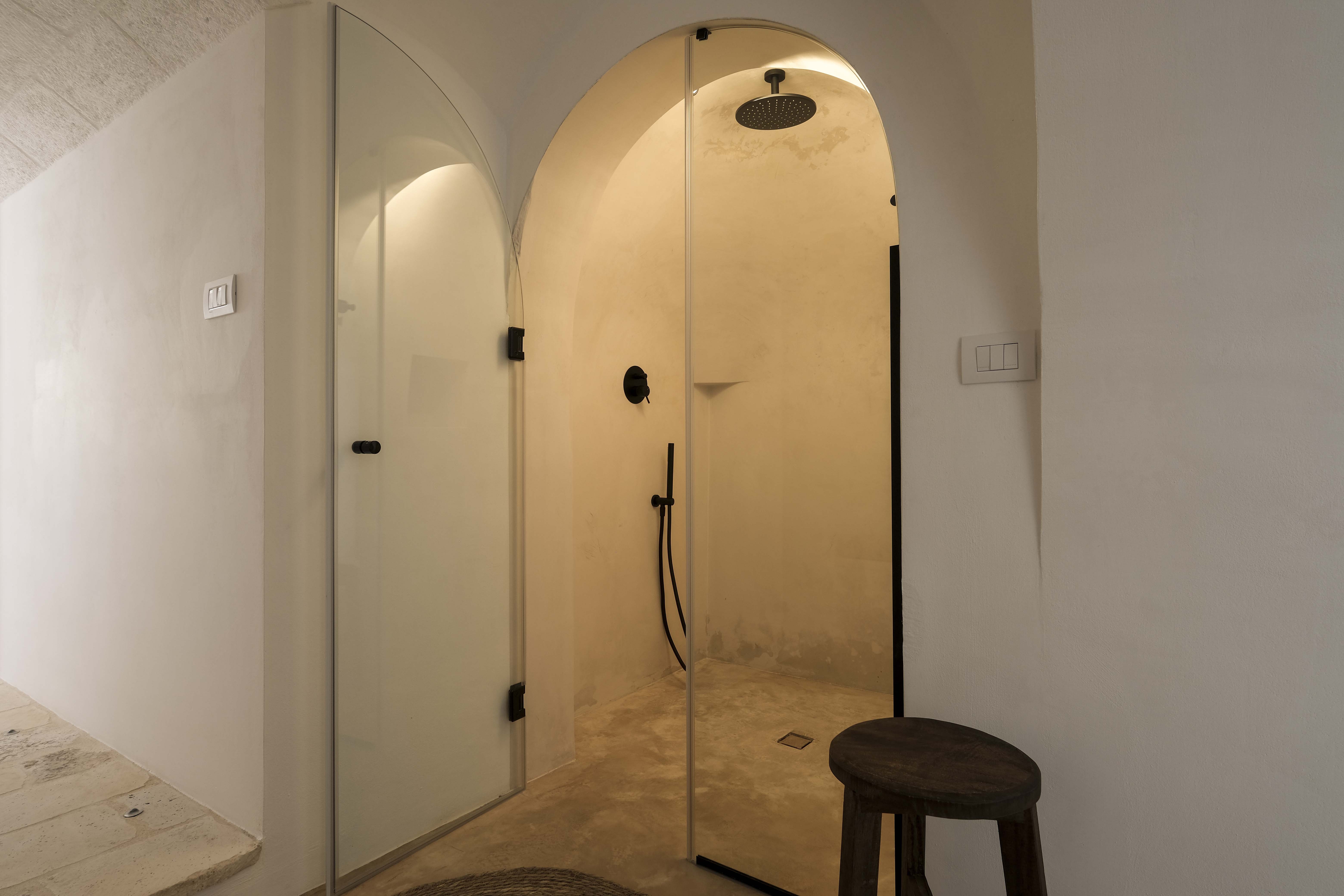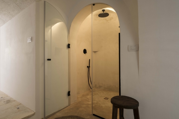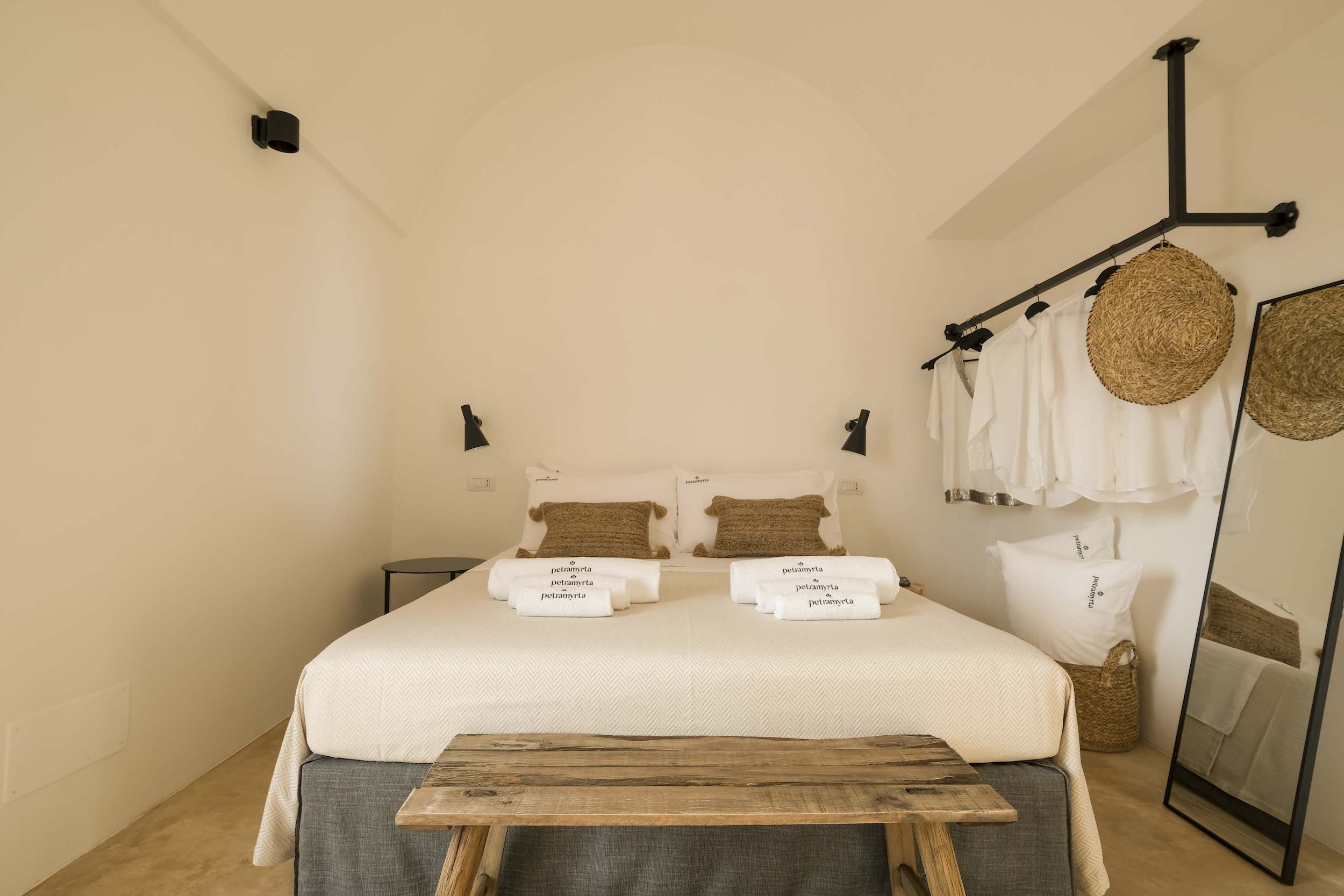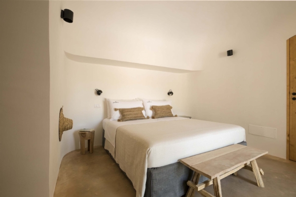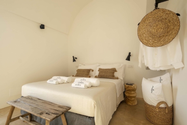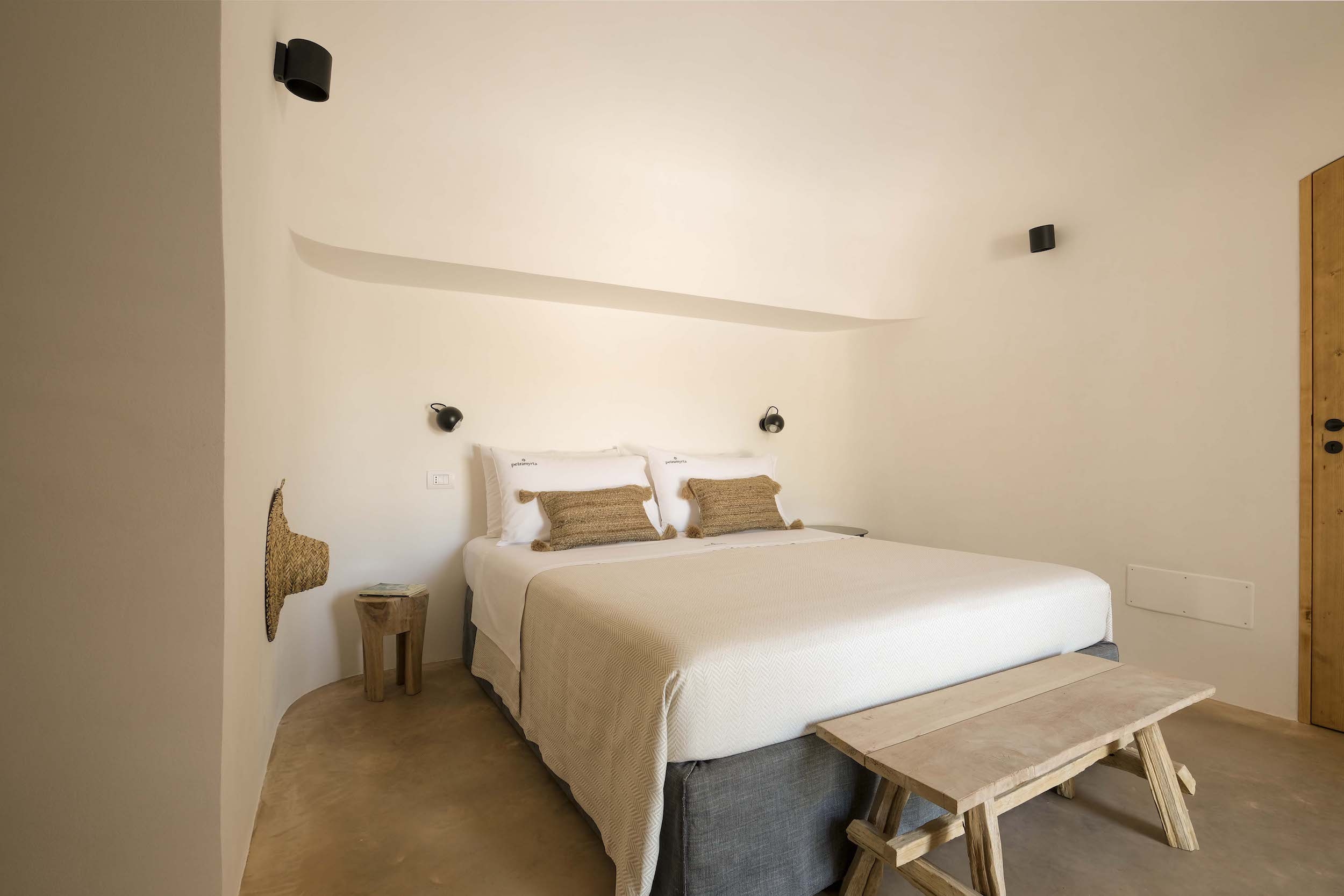 Suite Padronale 2: letto matrimoniale king-size e bagno en suite con doccia, affacciata sull’uliveto e sul patio anteriore, per un contatto intimo e rilassante con la natura circostante.
