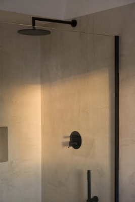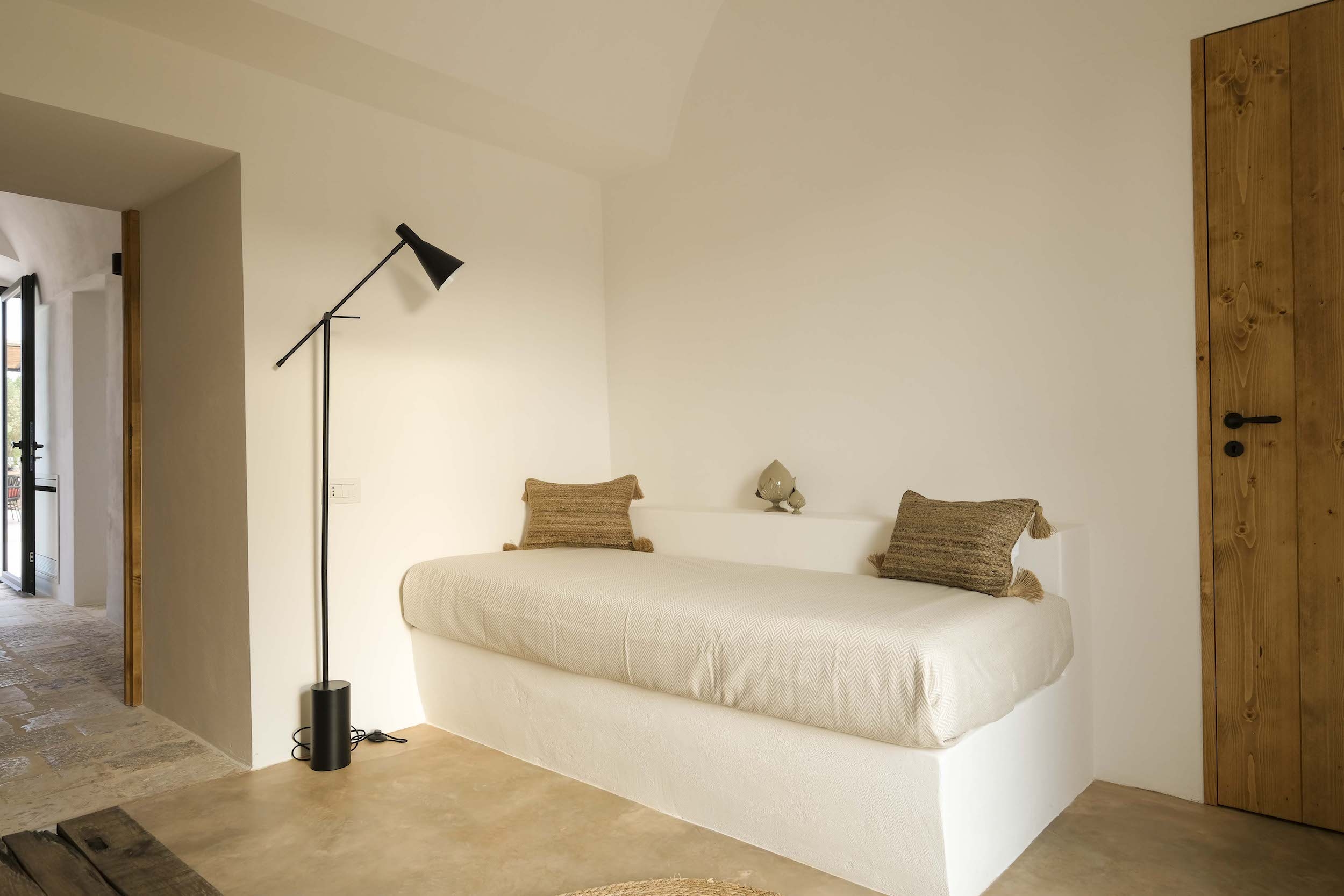 Suite Padronale 1 (tripla): letto matrimoniale king-size, letto singolo e bagno en suite con doccia, con accesso diretto alla zona piscina, per vivere senza sforzo l’armonia tra interno ed esterno.