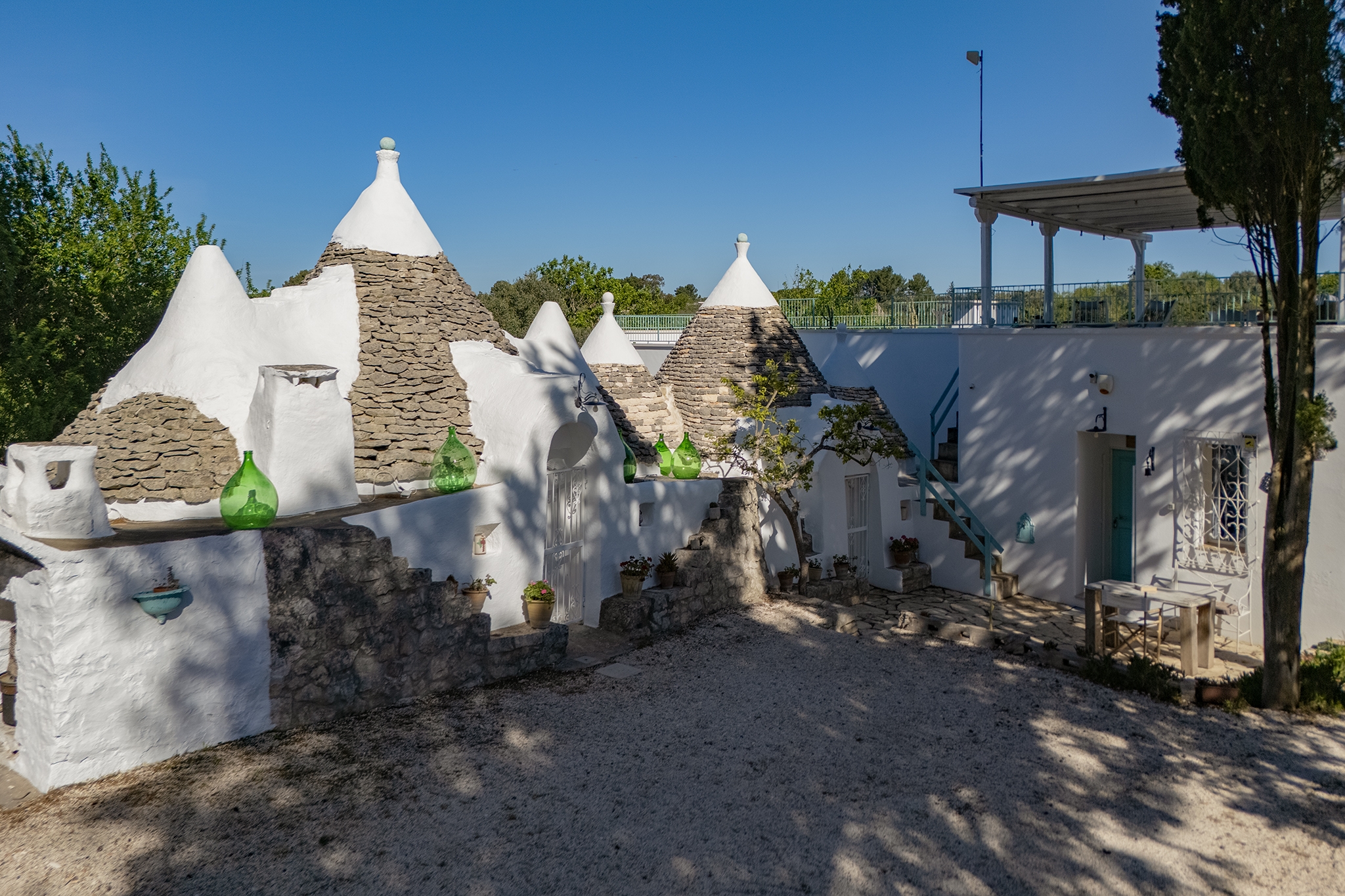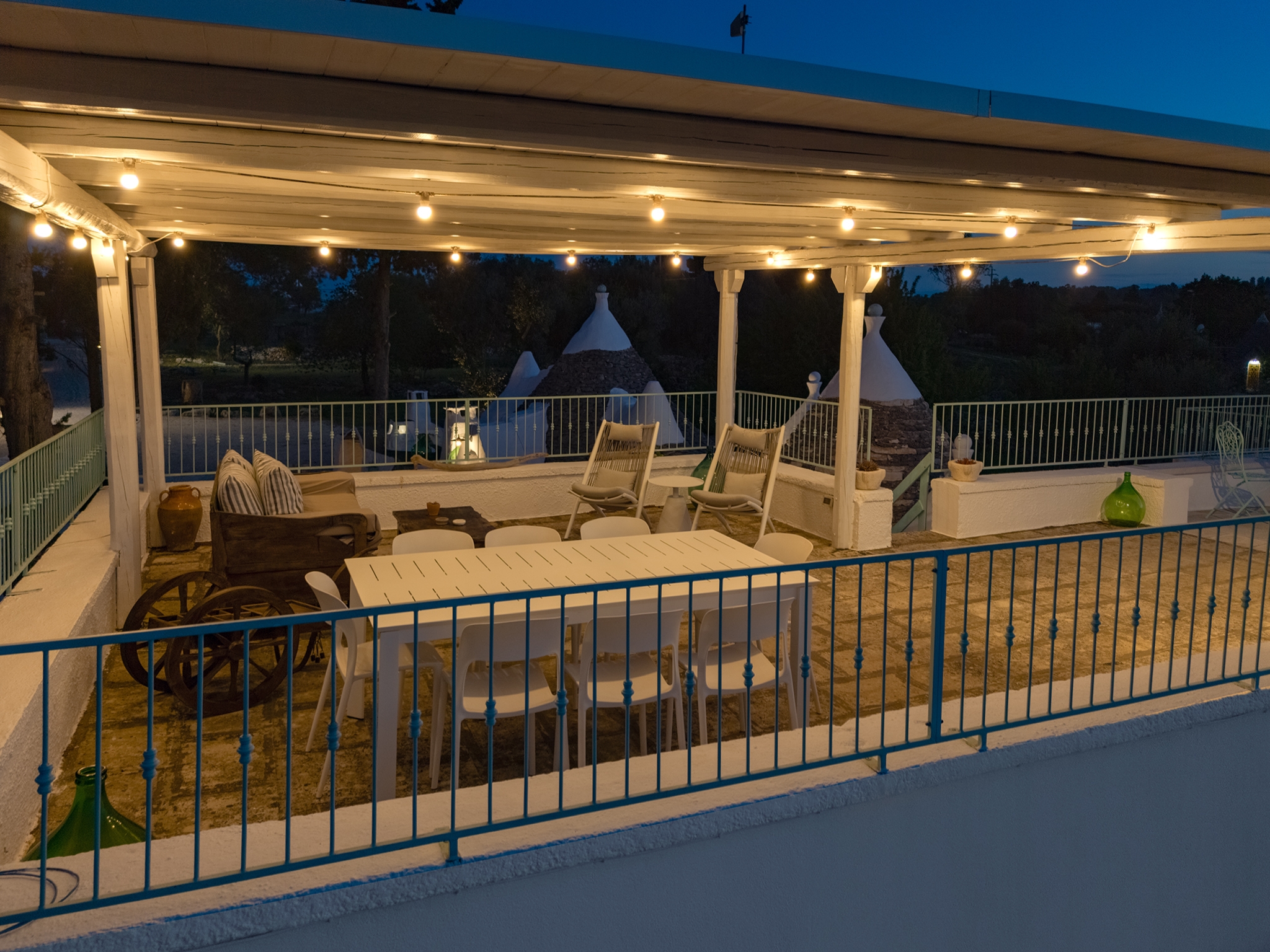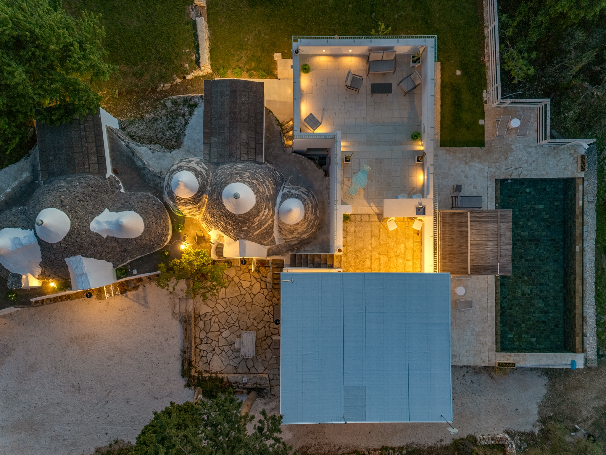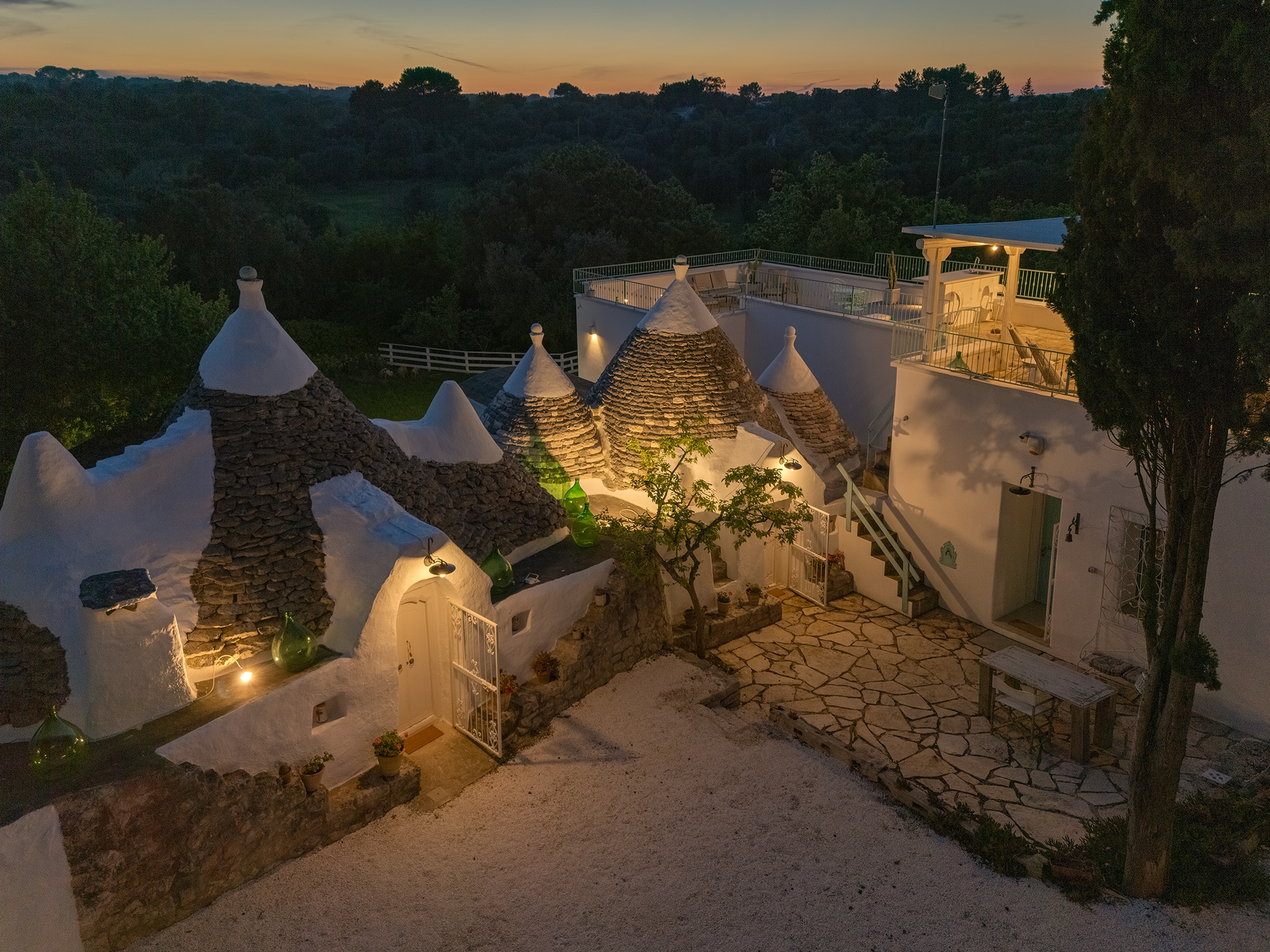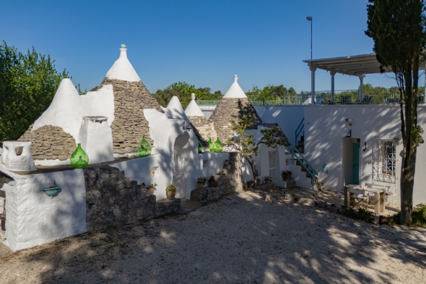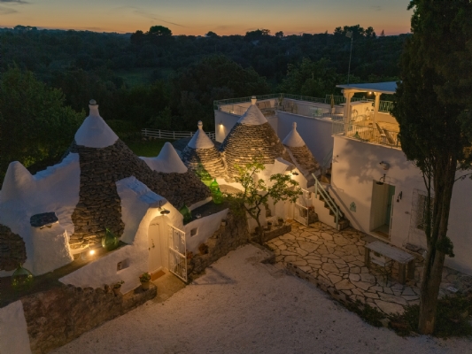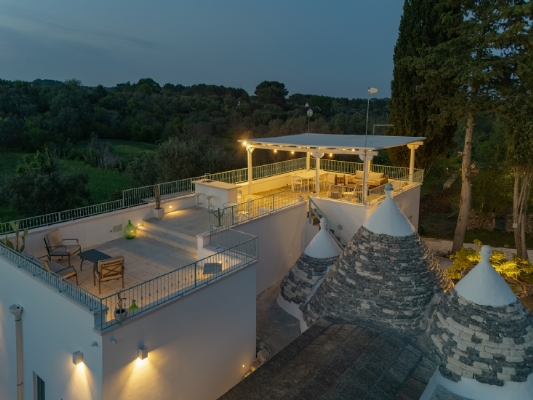 Questo straordinario complesso, oltre che da diversi spazi esterni dedicati allo svago e al relax, è composto da due trulli autentici di fine ‘800 a sei coni e una luminosa lamia con vetrata che si affaccia sul panorama della campagna, completati da una nuova suite con vista sulla piscina, per ospitare fino a 10 persone in 4 unità indipendenti, con 4 camere in totale: