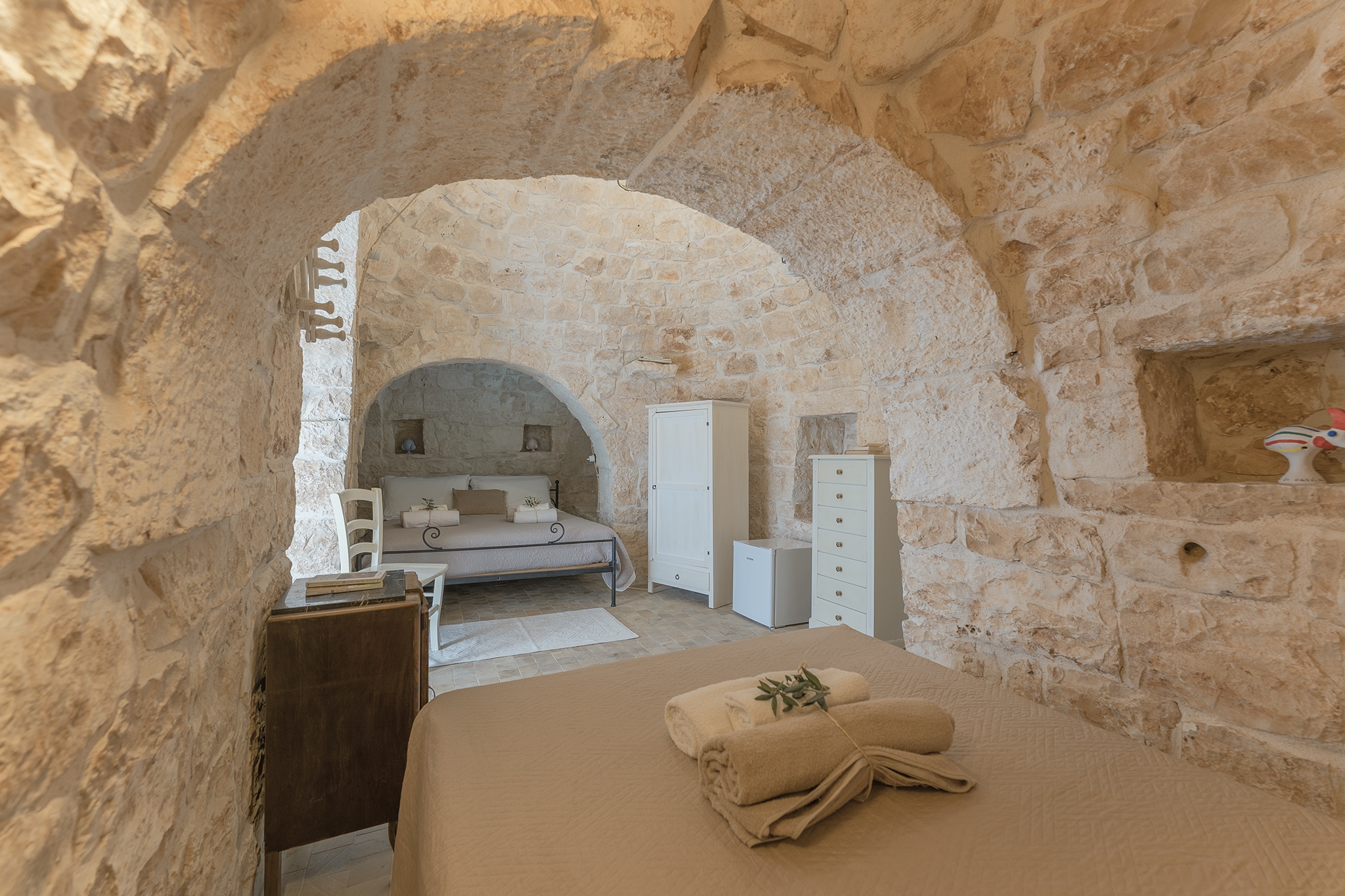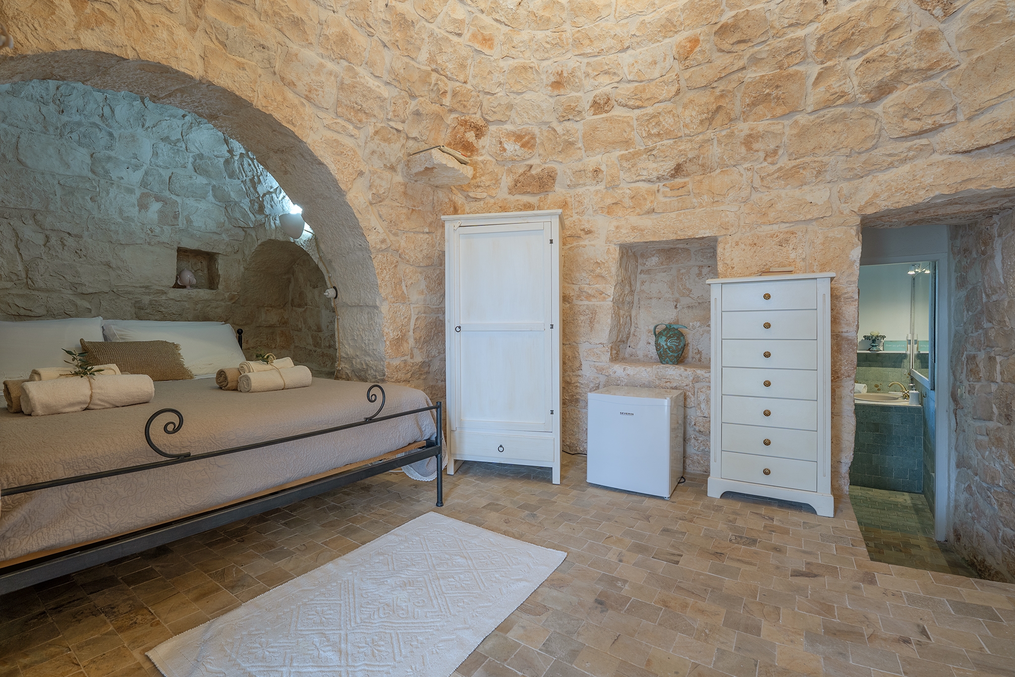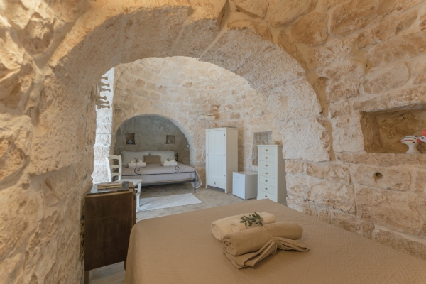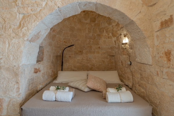 TRULLO ULIVO: ambiente indipendente con pietra a vista originale di fine ‘800, con le sue due alcove può ospitare 3 persone in quanto dotato di 1 letto matrimoniale e 1 ad una piazza e mezza, con bagno privato con le sue tipiche cementine turchesi e doccia idromassaggio
