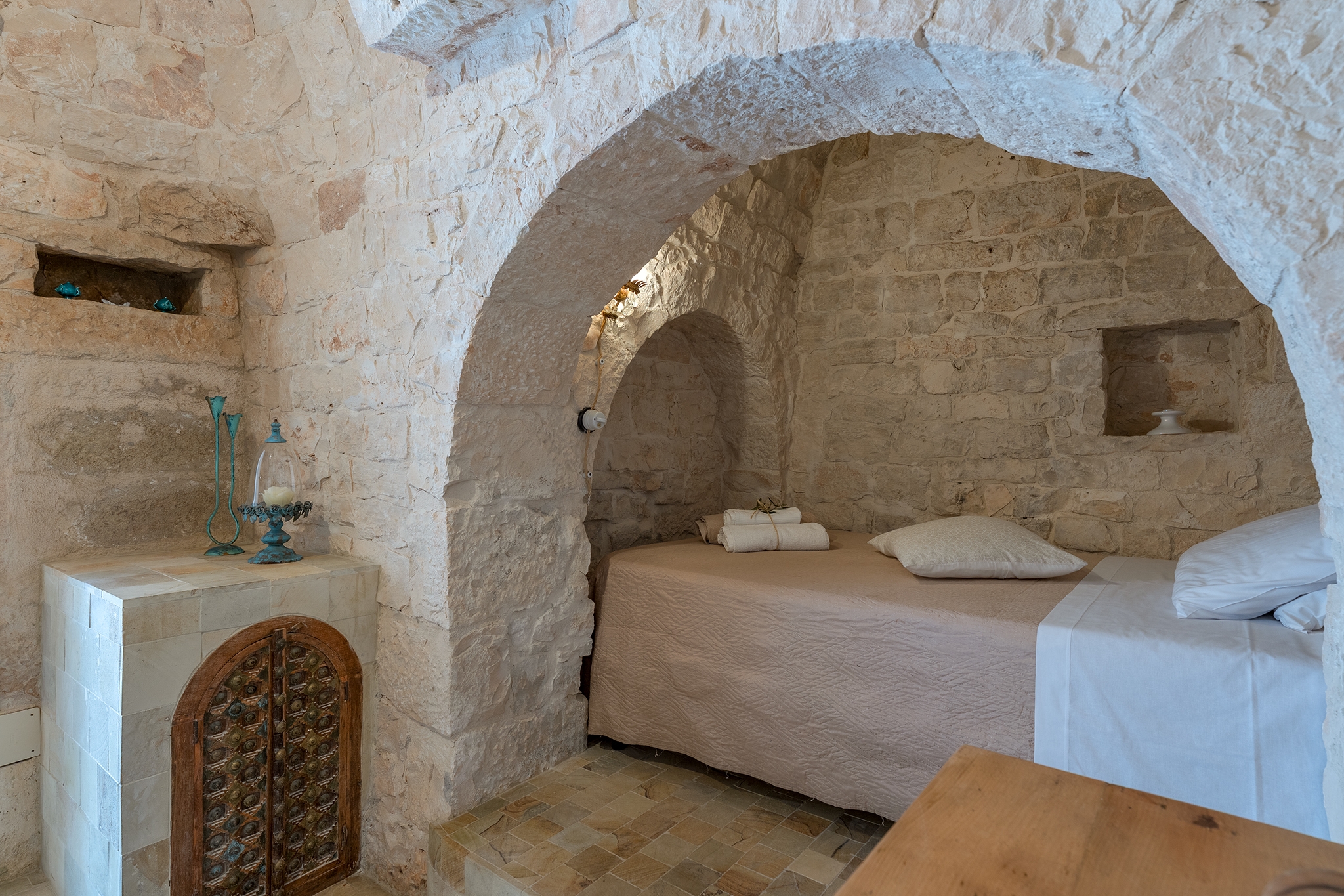 TRULLO MANDORLO: ambiente indipendente con pietra a vista originale di fine ‘800, con le sue due alcove può ospitare 3 persone in quanto dotato di 1 letto matrimoniale e 1 ad una piazza e mezza, con bagno privato con le sue tipiche cementine turchesi e doccia idromassaggio