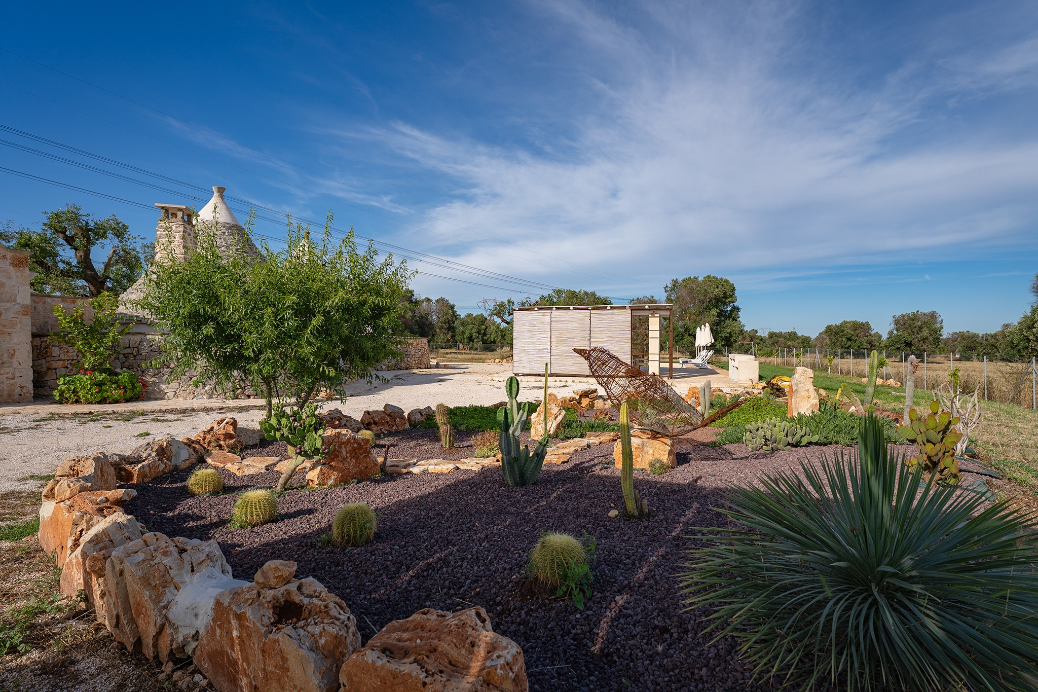 All'esterno vi è un giardino curato con piante grasse, fichi d’India e installazioni artistiche, una piscina privata con zona solarium e lettini e area pranzo all'aperto.