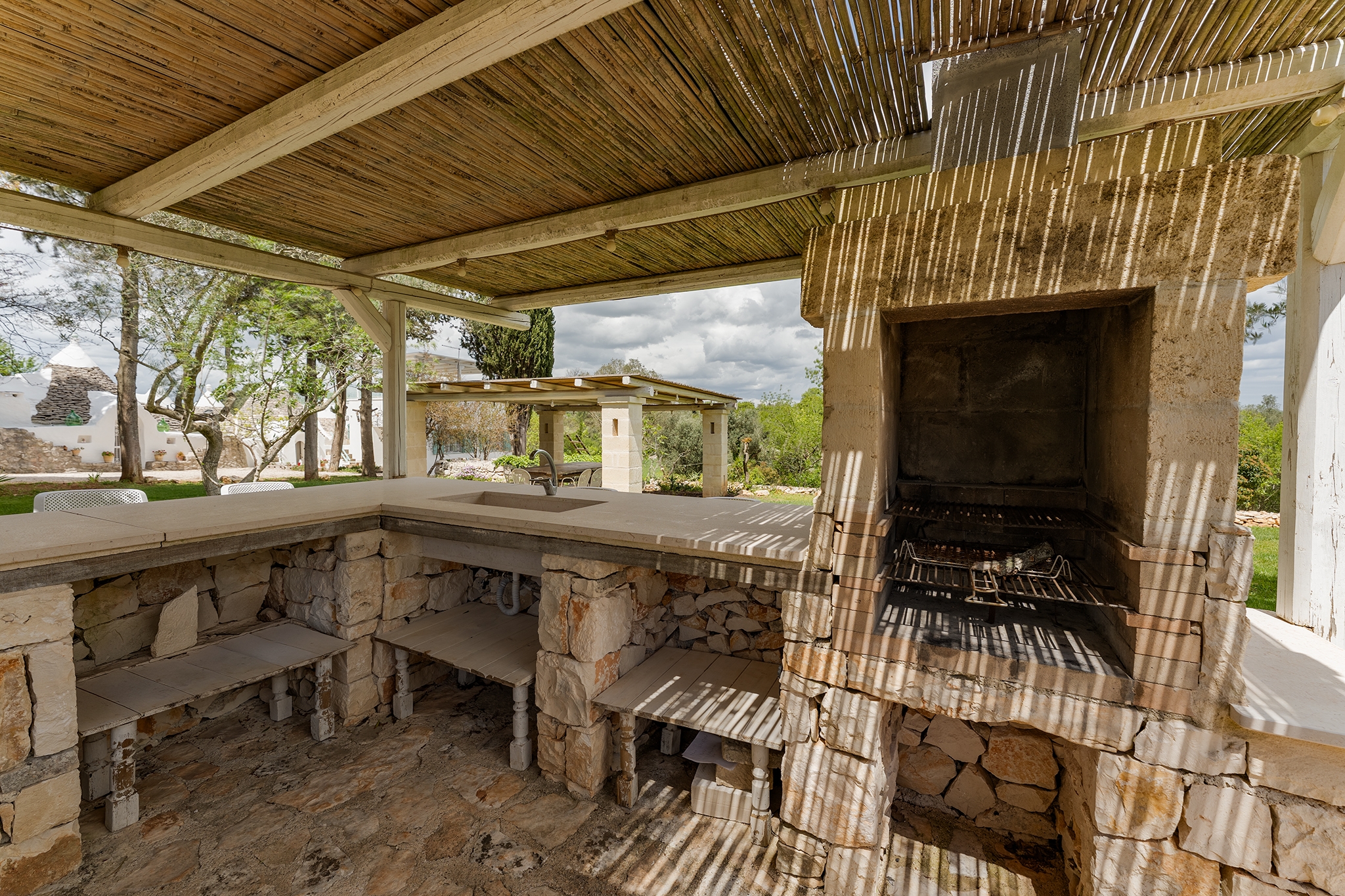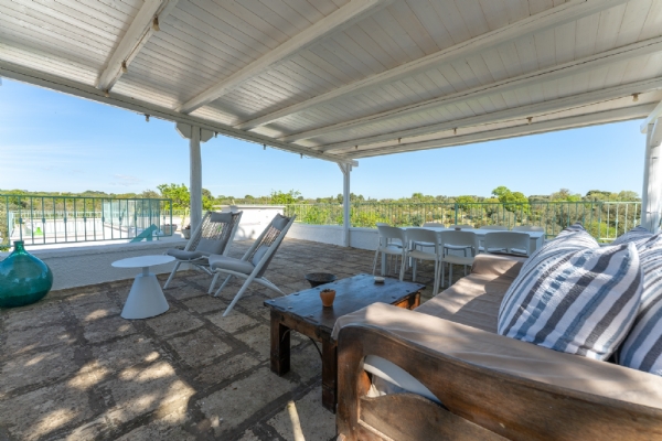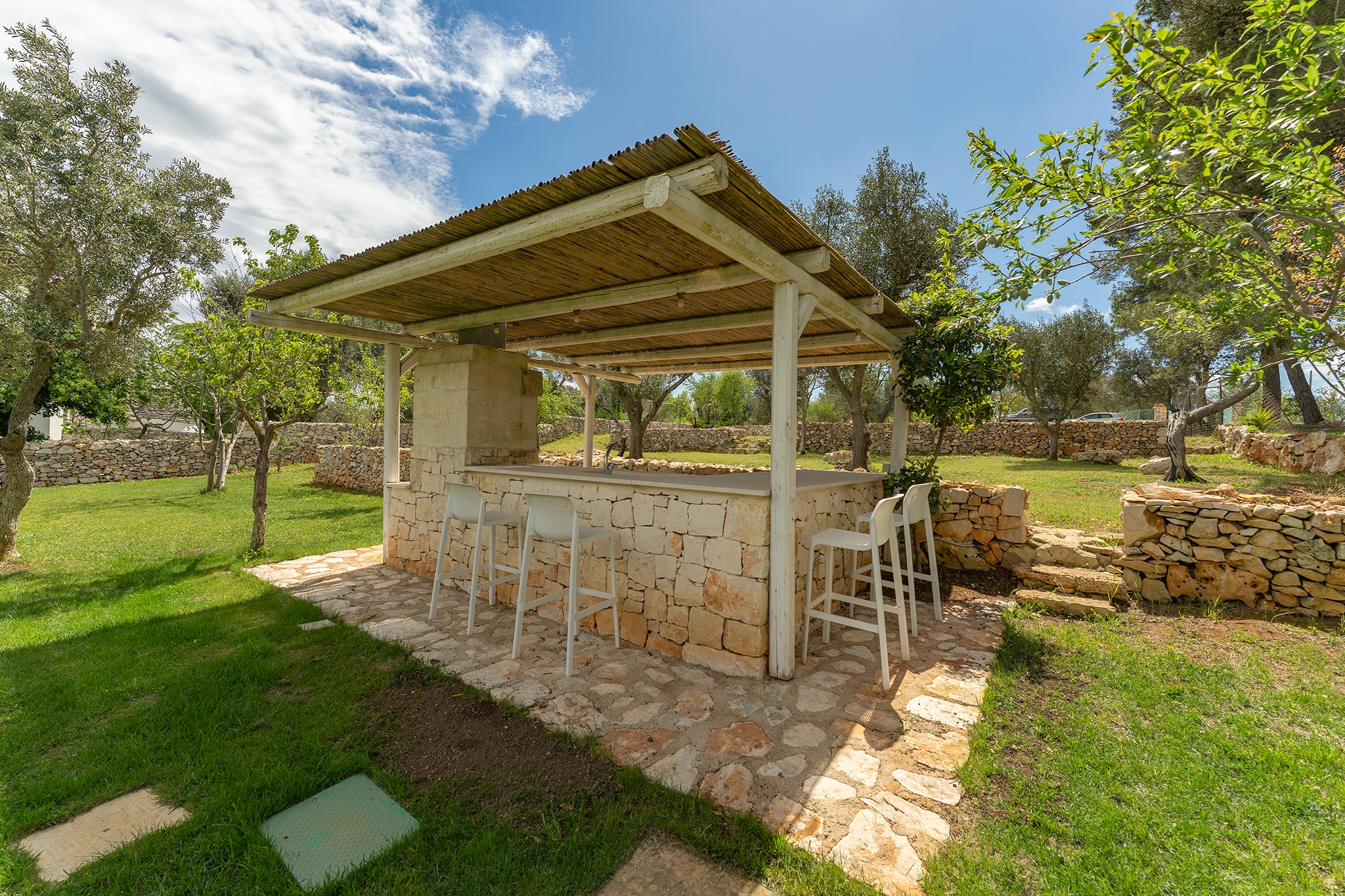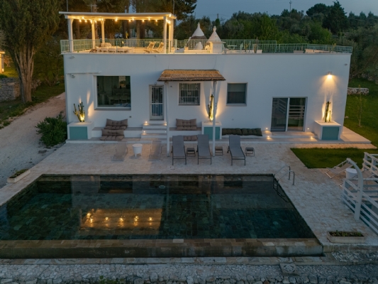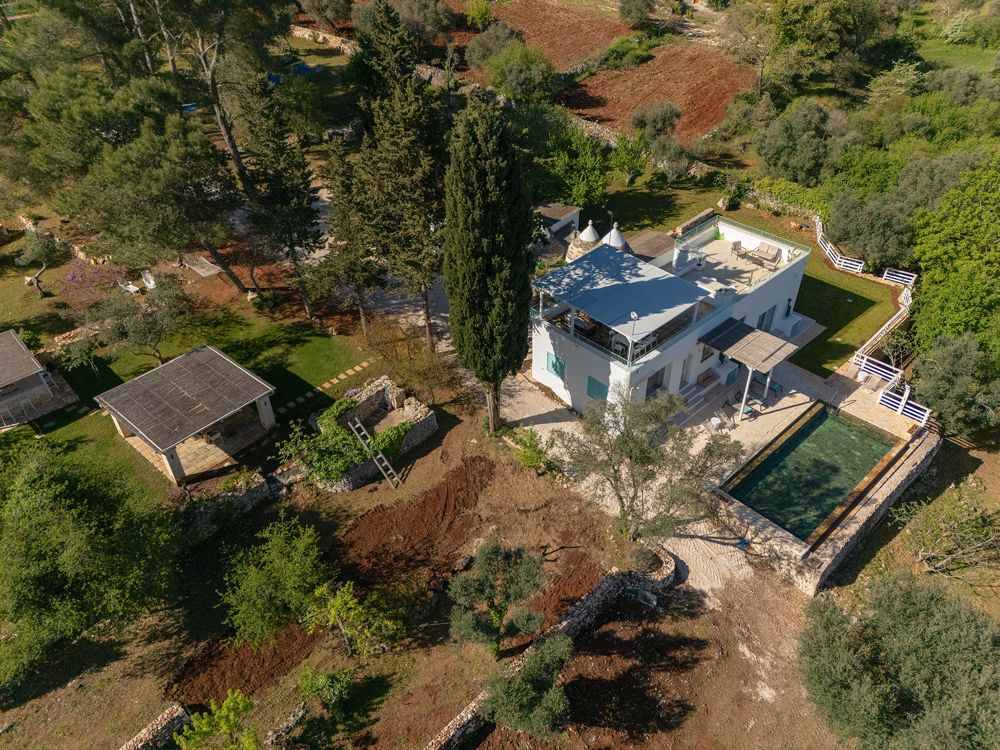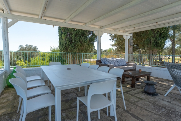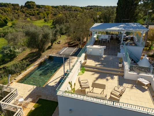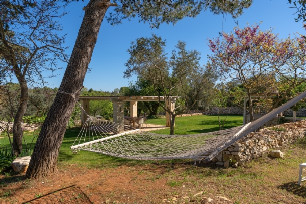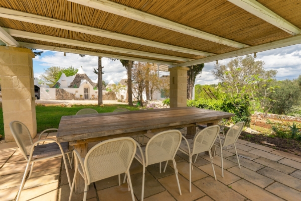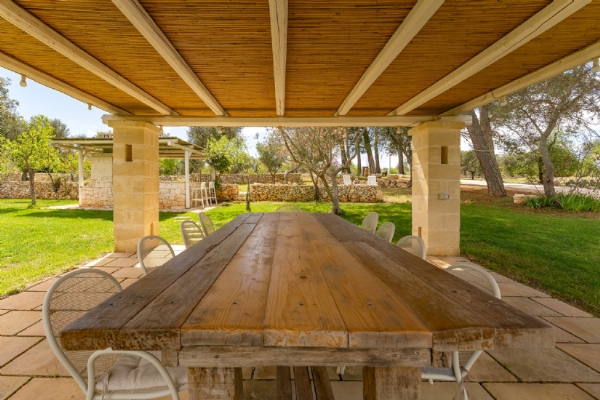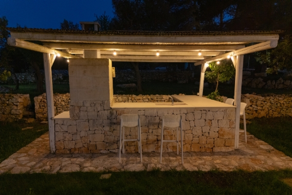 All’esterno, una varietà di ambienti immersi nella natura vi offre un’esperienza unica: la piscina a sfioro in pietra, circondata da muretti a secco e terrazzi, offre una vista panoramica incantevole sui campi disseminati di ulivi, castagni, noci, gelsi e alberi di fico, perfetta per ammirare i tramonti pugliesi. Un secondo terrazzo sopraelevato sovrasta la lamia, regalando una vista a 360° su uliveti, mandorli, alberi da frutto e pini di Aleppo, dove potrete rilassarvi nei freschi crepuscoli estivi. A completare l’esperienza outdoor, un pergolato sul prato per godere di momenti conviviali al fresco, accanto a una cucina esterna completamente in pietra locale con un barbecue attrezzatissimo, e a un antico forno a legna, ideali per preparare pizze e grigliate dal gusto inconfondibile.