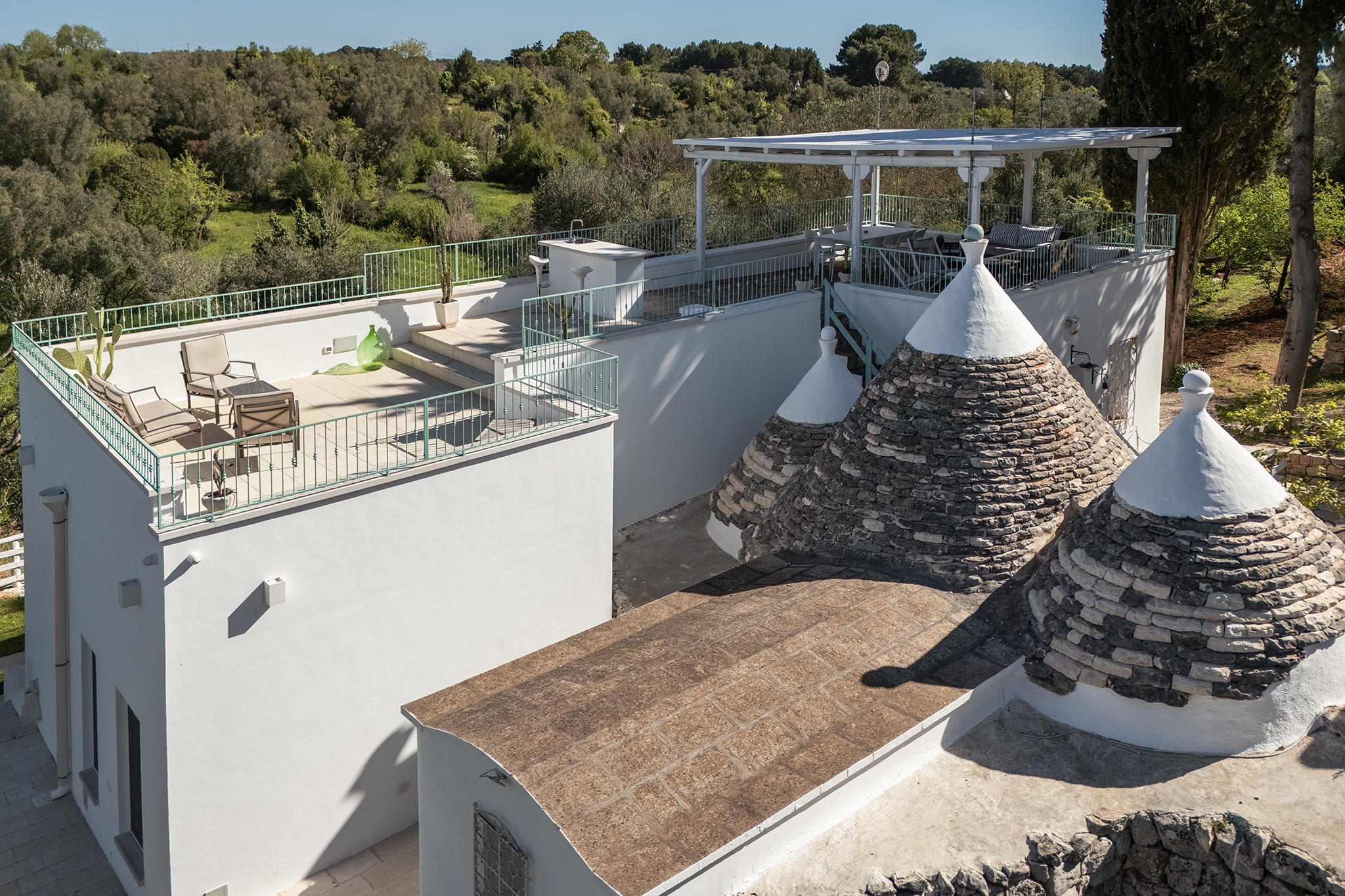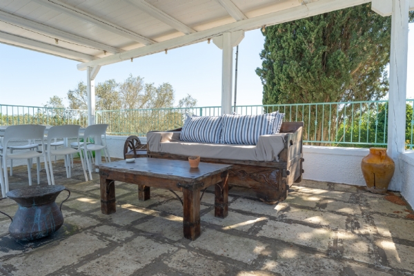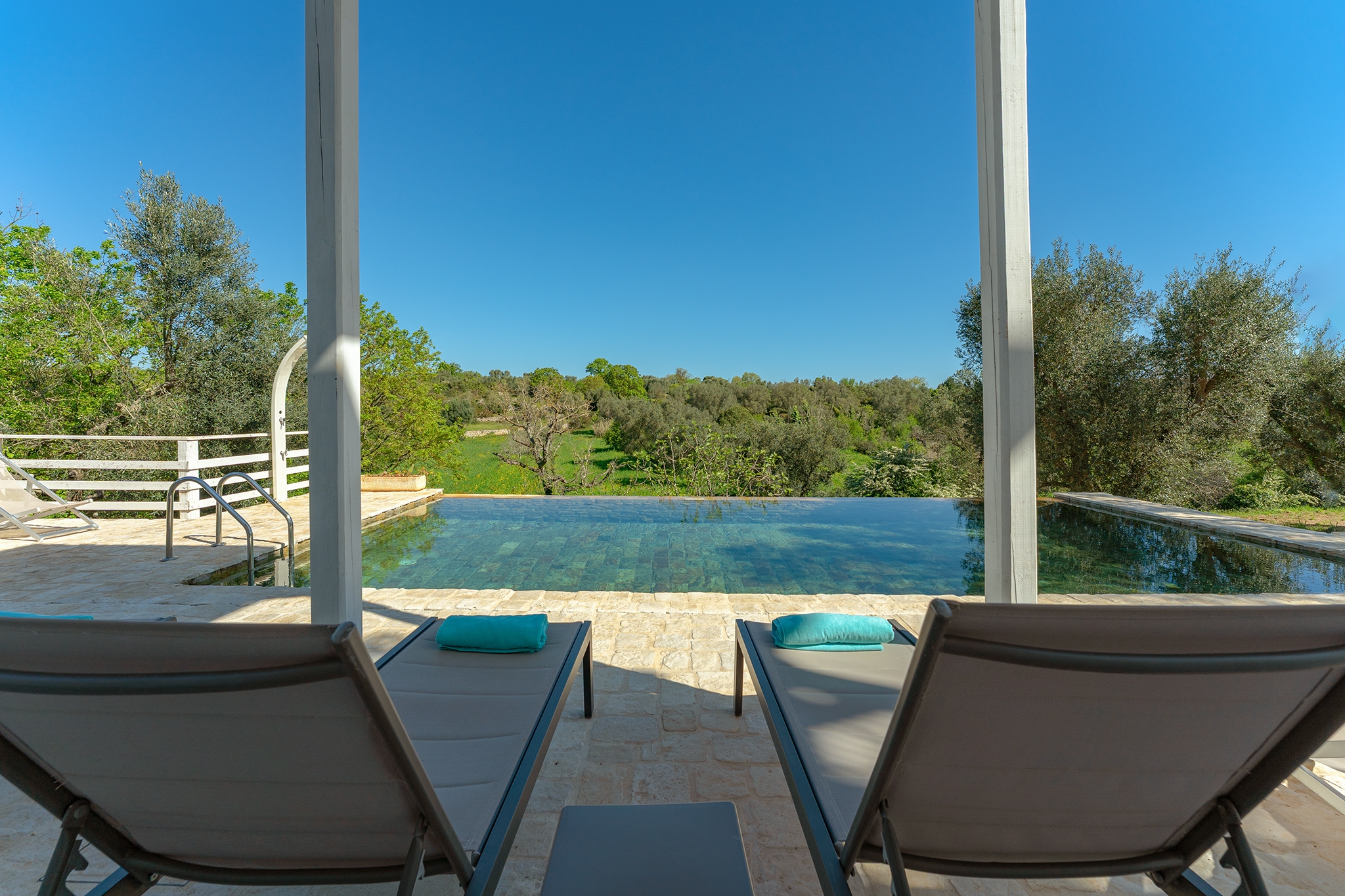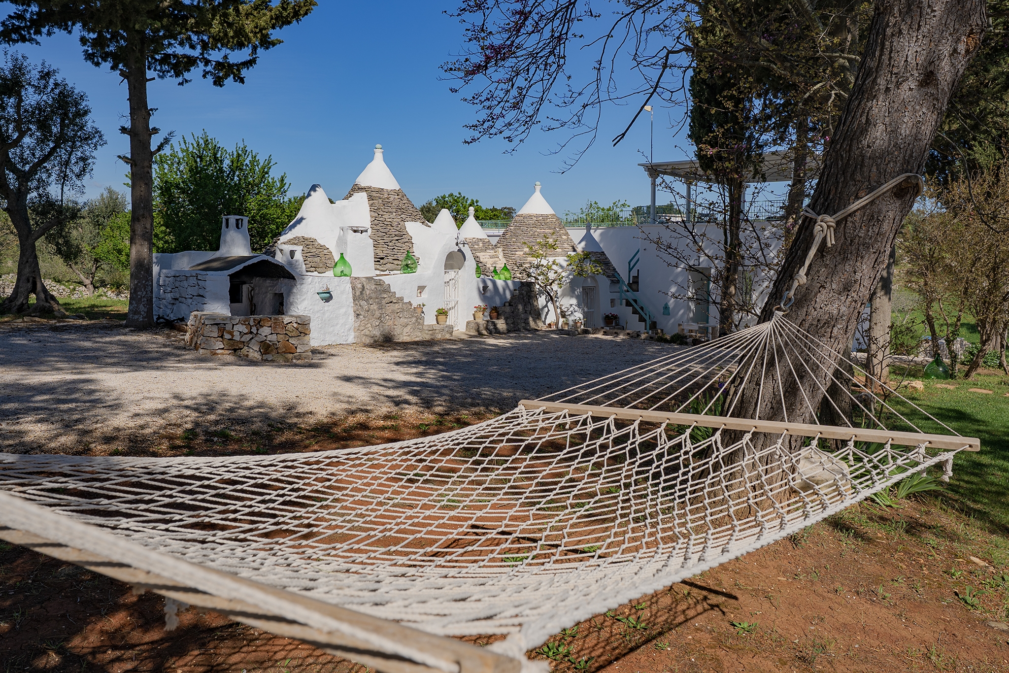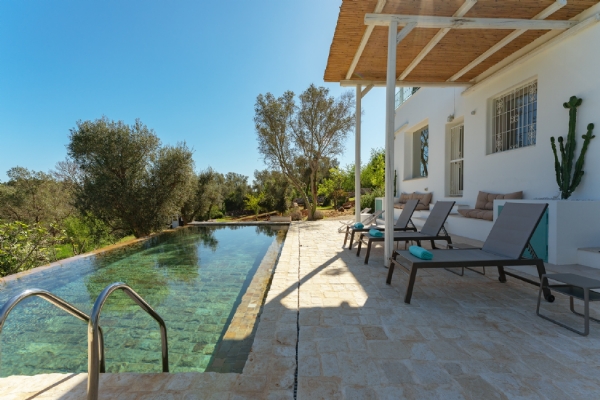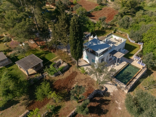 All’esterno, una varietà di ambienti immersi nella natura vi offre un’esperienza unica: la piscina a sfioro in pietra, circondata da muretti a secco e terrazzi, offre una vista panoramica incantevole sui campi disseminati di ulivi, castagni, noci, gelsi e alberi di fico, perfetta per ammirare i tramonti pugliesi. Un secondo terrazzo sopraelevato sovrasta la lamia, regalando una vista a 360° su uliveti, mandorli, alberi da frutto e pini di Aleppo, dove potrete rilassarvi nei freschi crepuscoli estivi. A completare l’esperienza outdoor, un pergolato sul prato per godere di momenti conviviali al fresco, accanto a una cucina esterna completamente in pietra locale con un barbecue attrezzatissimo, e a un antico forno a legna, ideali per preparare pizze e grigliate dal gusto inconfondibile.