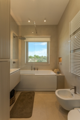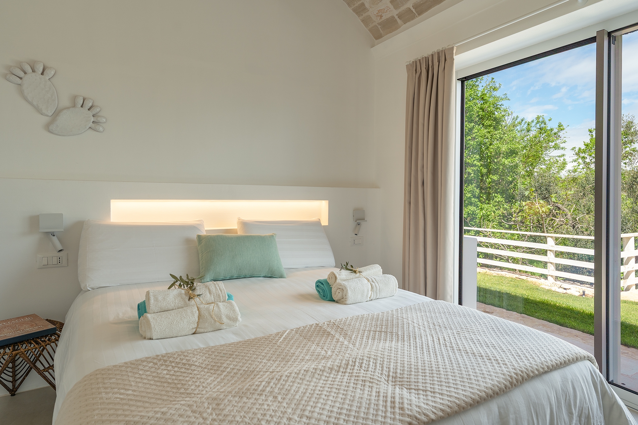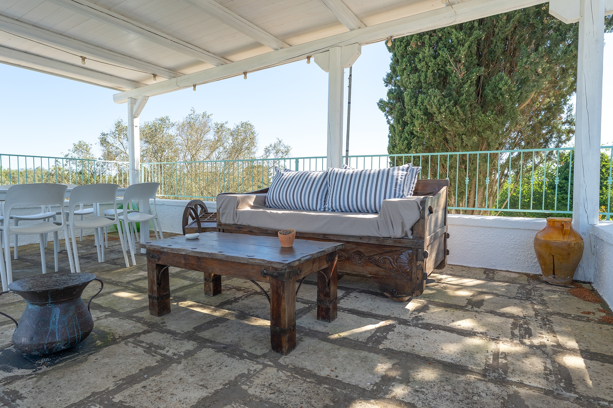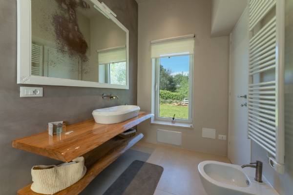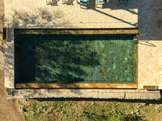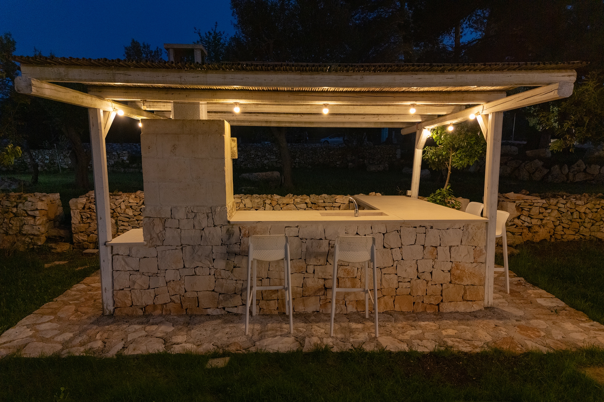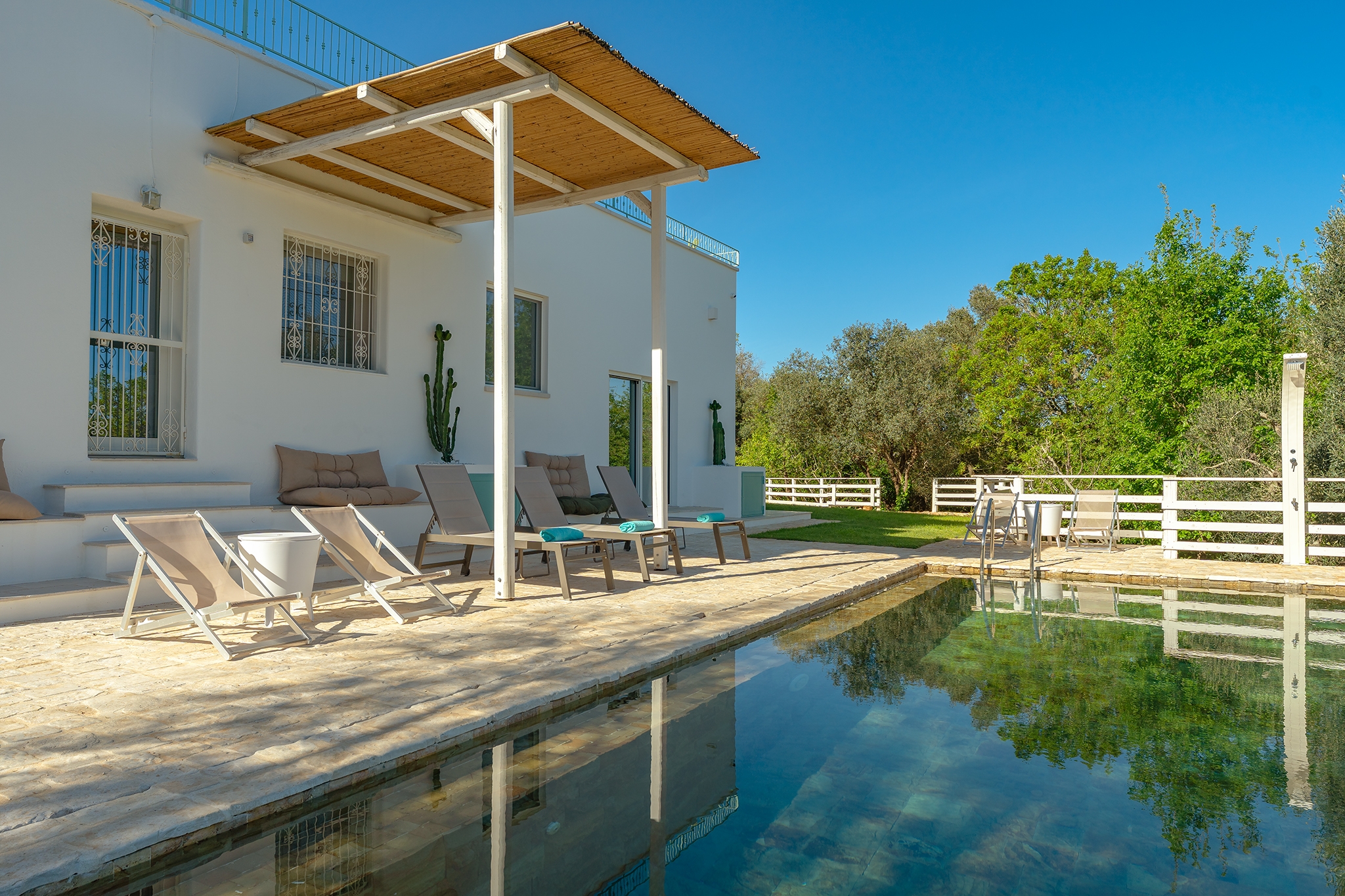 All’esterno, una varietà di ambienti immersi nella natura vi offre un’esperienza unica: la piscina a sfioro in pietra, circondata da muretti a secco e terrazzi, offre una vista panoramica incantevole sui campi disseminati di ulivi, castagni, noci, gelsi e alberi di fico, perfetta per ammirare i tramonti pugliesi. Un secondo terrazzo sopraelevato sovrasta la lamia, regalando una vista a 360° su uliveti, mandorli, alberi da frutto e pini di Aleppo, dove potrete rilassarvi nei freschi crepuscoli estivi. A completare l’esperienza outdoor, un pergolato sul prato per godere di momenti conviviali al fresco, accanto a una cucina esterna completamente in pietra locale con un barbecue attrezzatissimo, e a un antico forno a legna, ideali per preparare pizze e grigliate dal gusto inconfondibile.