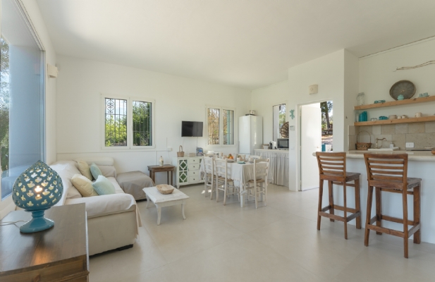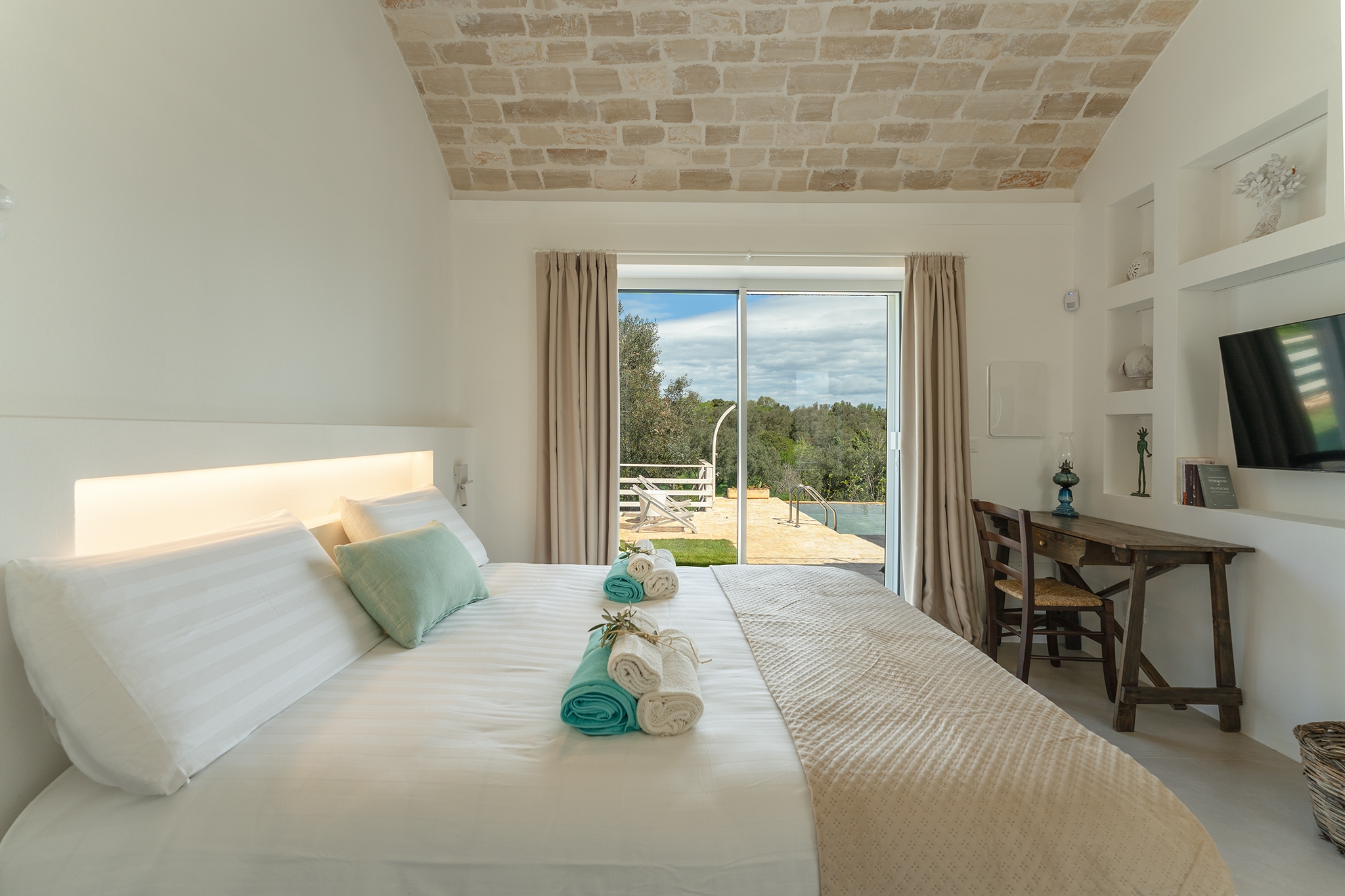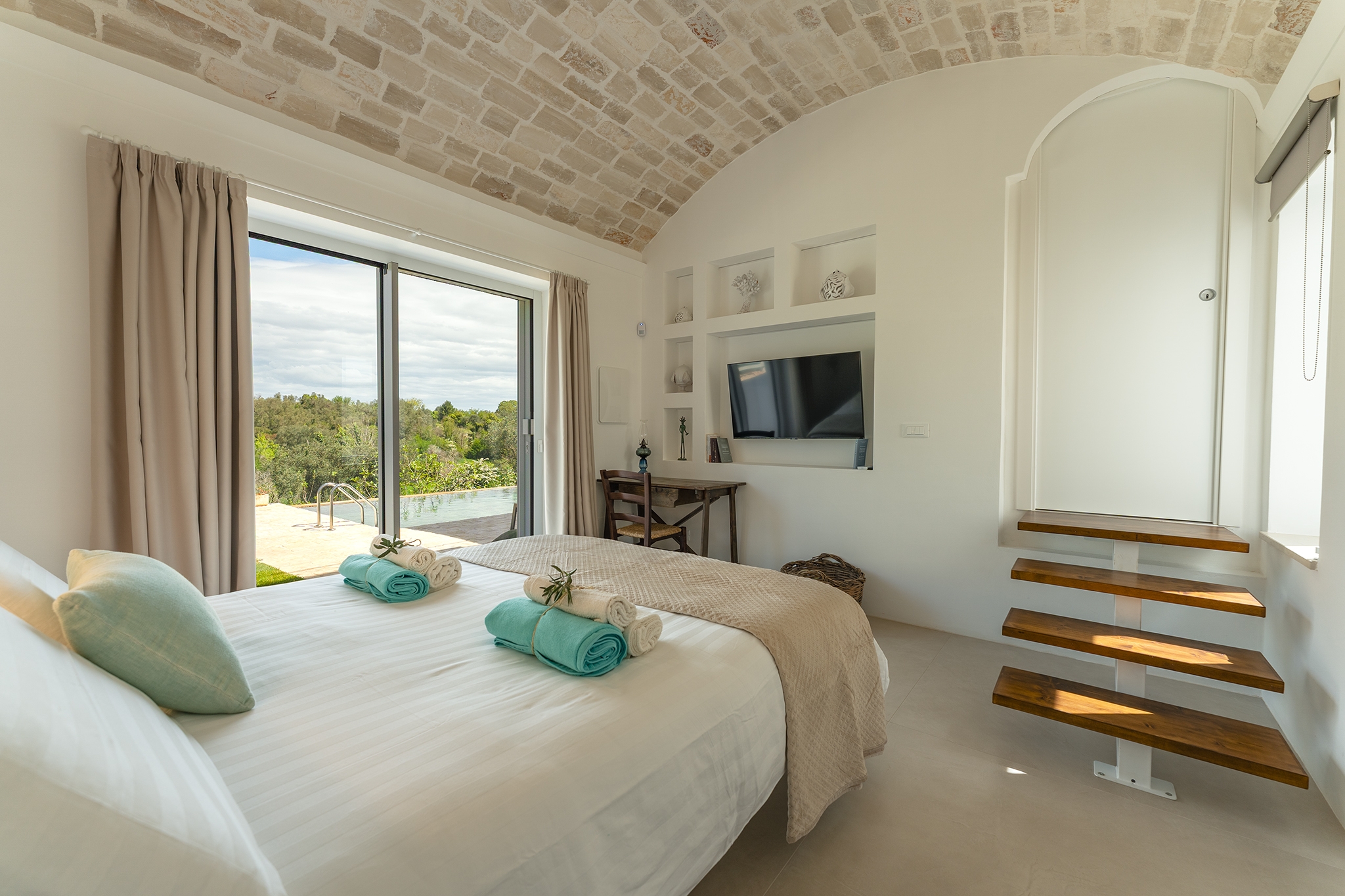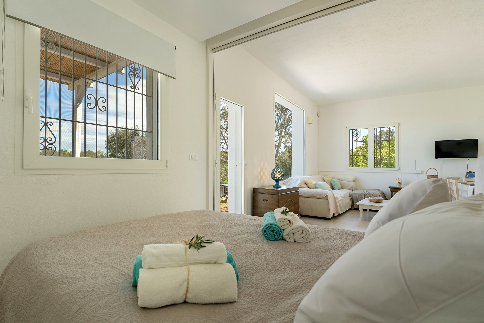 LAMIA PANORAMA: è un ampio spazio dotato di aria condizionata, con una enorme vetrata che si affaccia sulla piscina e sul panorama della campagna di ulivi, ospita la zona living con angolo cucina e, con il suo divisorio a scomparsa, ospita anche una camera matrimoniale per 2 persone con divano letto e bagno privato;