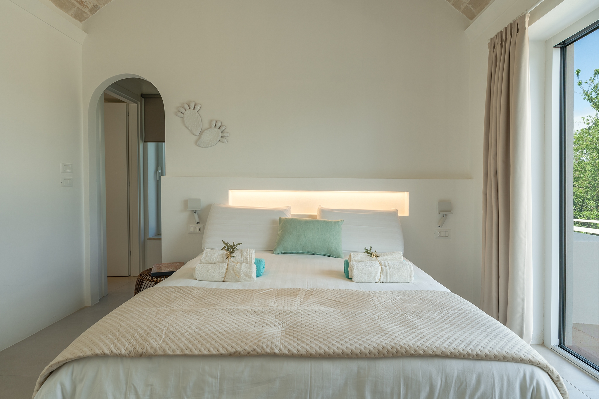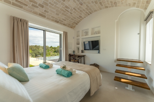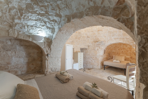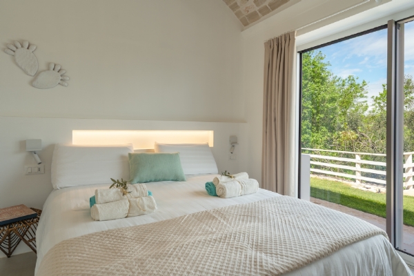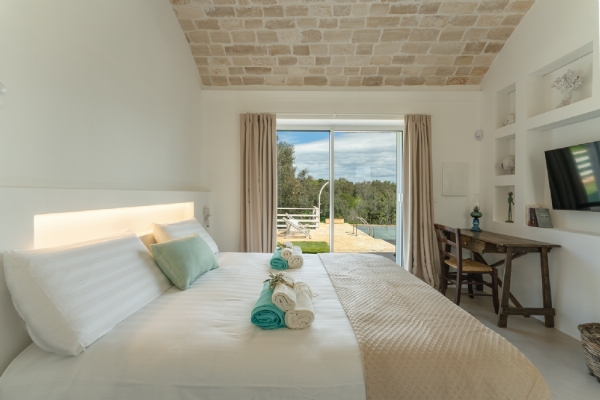 LAMIA LIBELLULA: suite di nuova ristrutturazione, dotata di aria condizionata, con volta a botte in pietra di Trani, può ospitare 2 persone, dotata di camera matrimoniale, cabina armadio e ampio bagno privato con doccia walk-in, con vista sui trulli e sulla piscina;