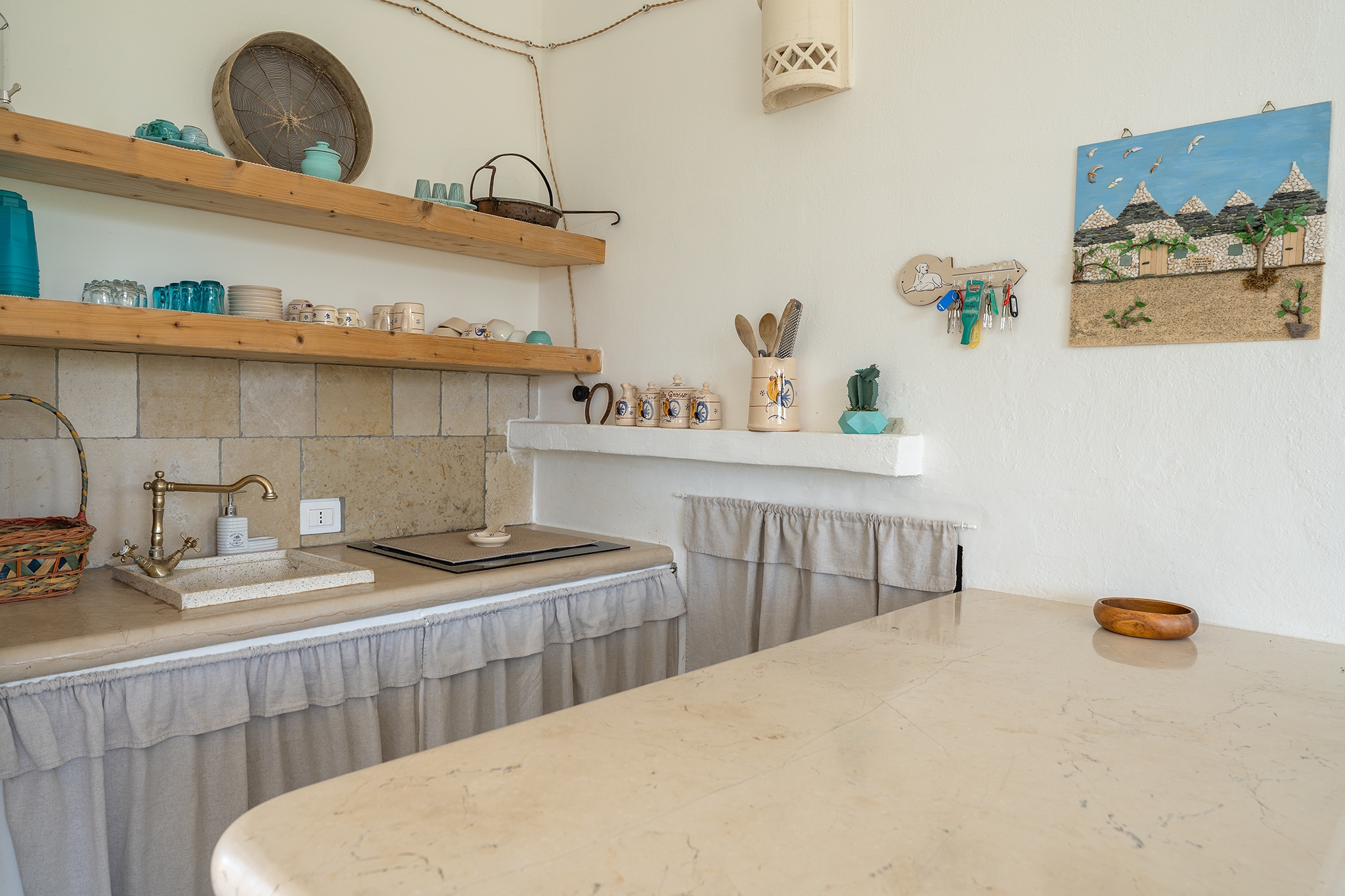Per la loro tipica natura architettonica (mura profonde di oltre 1 mt) che li rende freschi d’estate e per preservare la loro autenticità, l'aria condizionata non è presente nei trulli. Gli interni raccontano la storia e l’eleganza del territorio e vi invitano a godere di momenti di autentico piacere e convivialità.