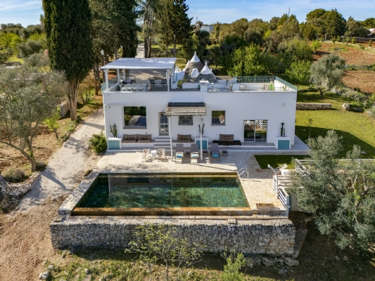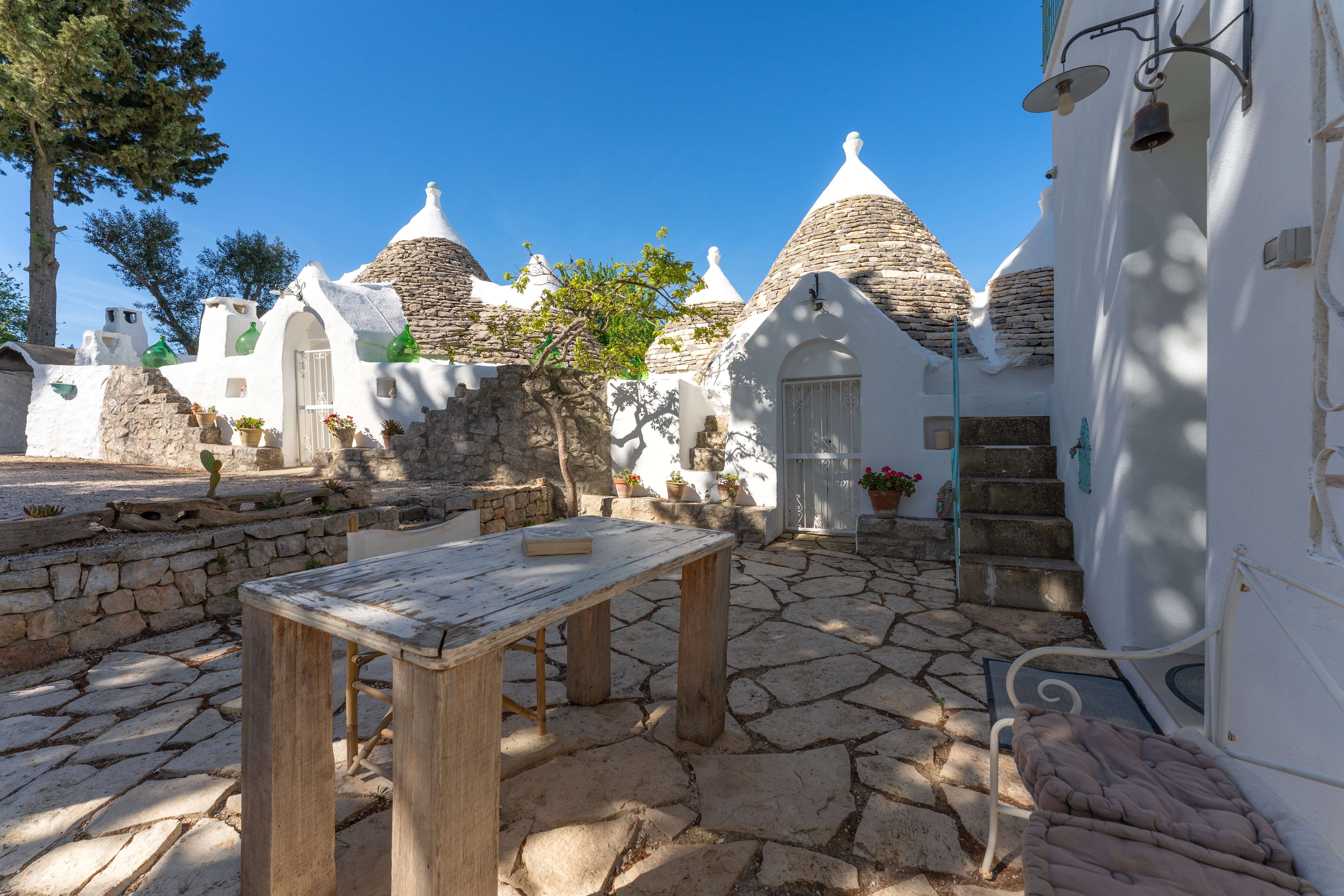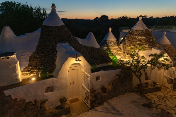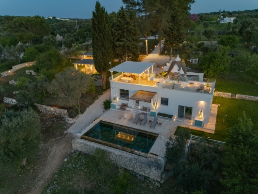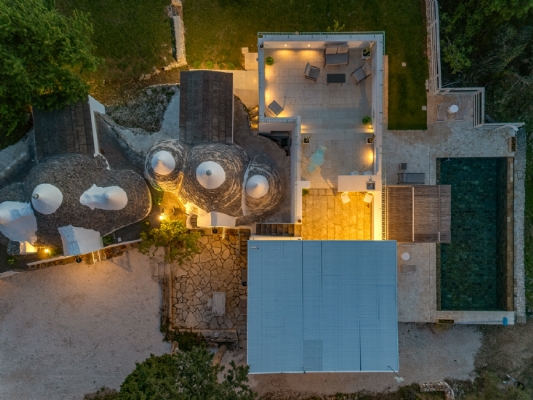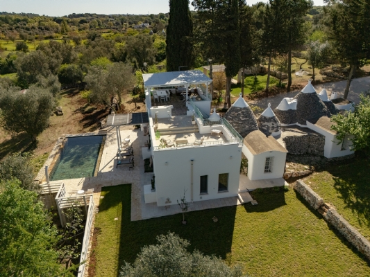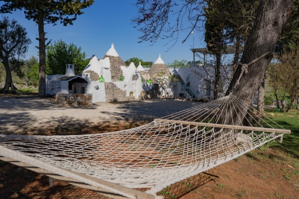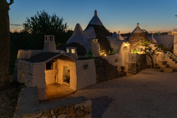 Questo straordinario complesso, oltre che da diversi spazi esterni dedicati allo svago e al relax, è composto da due trulli autentici di fine ‘800 a sei coni e una luminosa lamia con vetrata che si affaccia sul panorama della campagna, completati da una nuova suite con vista sulla piscina, per ospitare fino a 10 persone in 4 unità indipendenti, con 4 camere in totale: