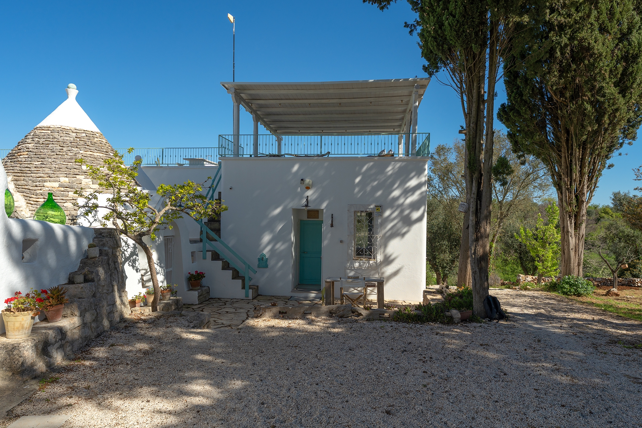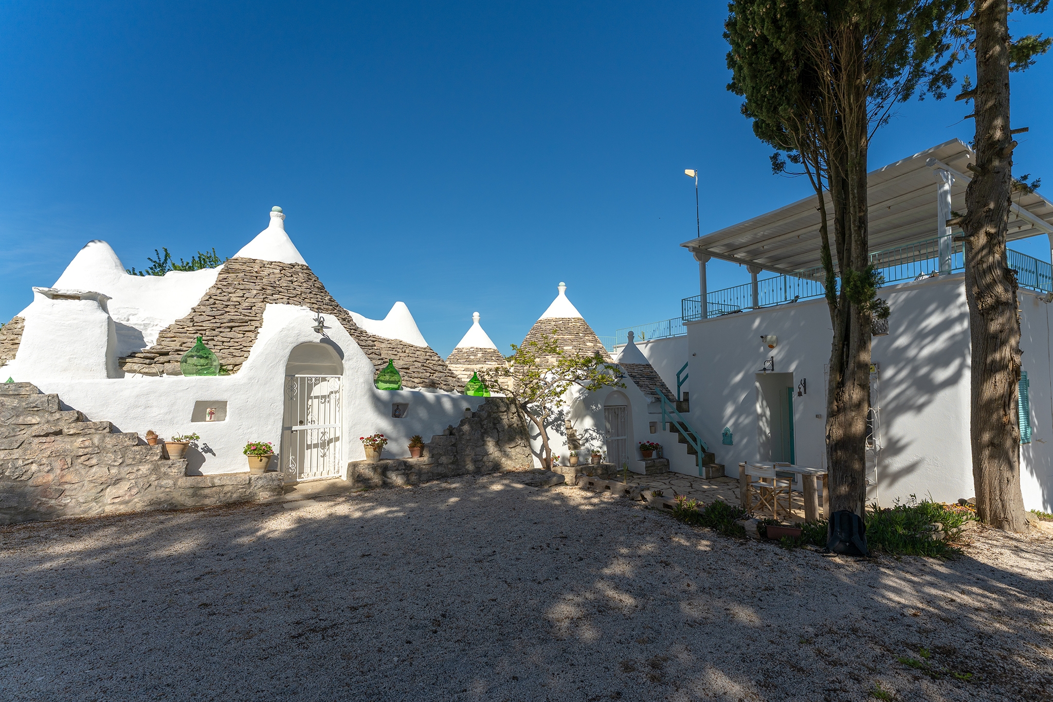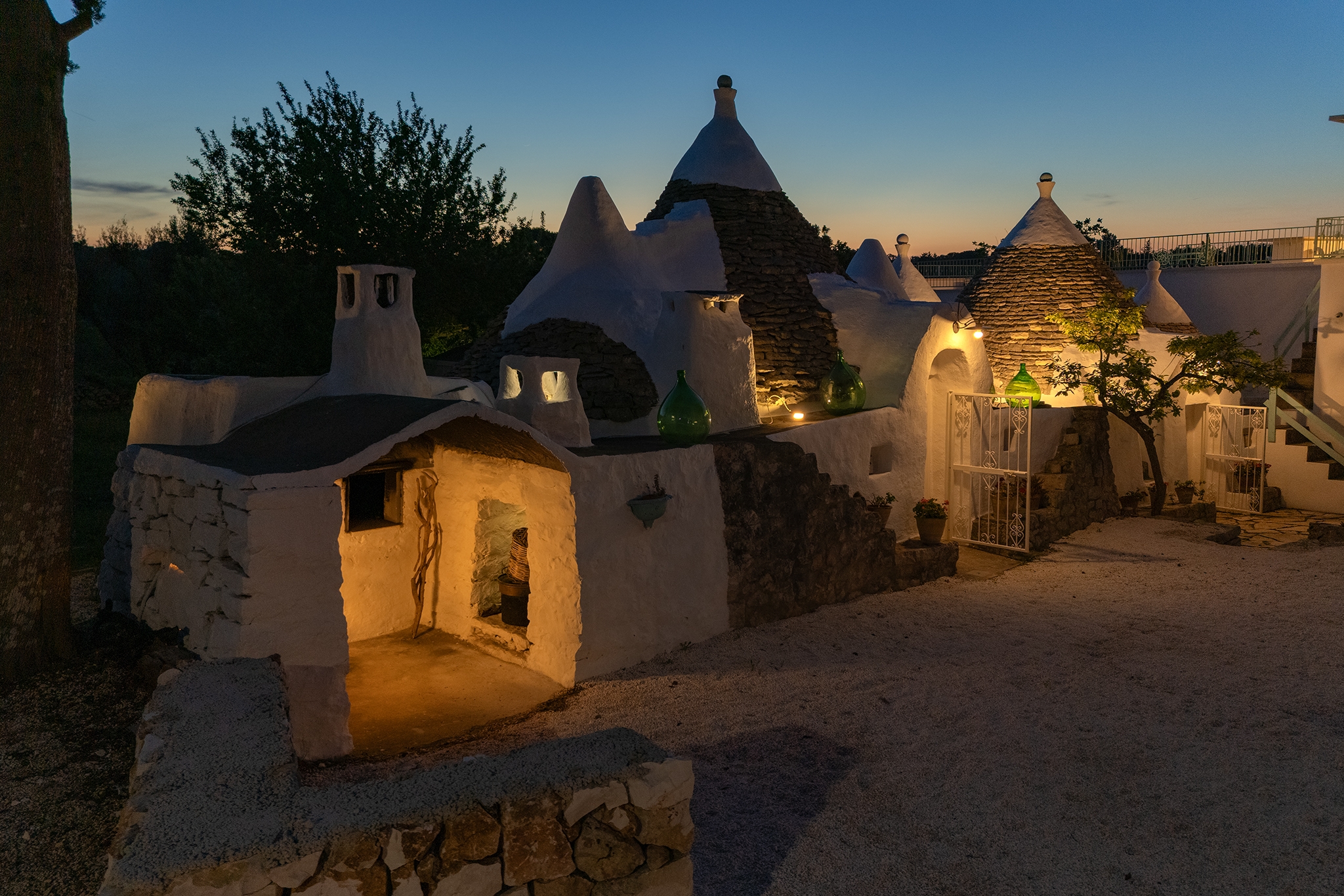 Questo straordinario complesso, oltre che da diversi spazi esterni dedicati allo svago e al relax, è composto da due trulli autentici di fine ‘800 a sei coni e una luminosa lamia con vetrata che si affaccia sul panorama della campagna, completati da una nuova suite con vista sulla piscina, per ospitare fino a 10 persone in 4 unità indipendenti, con 4 camere in totale: