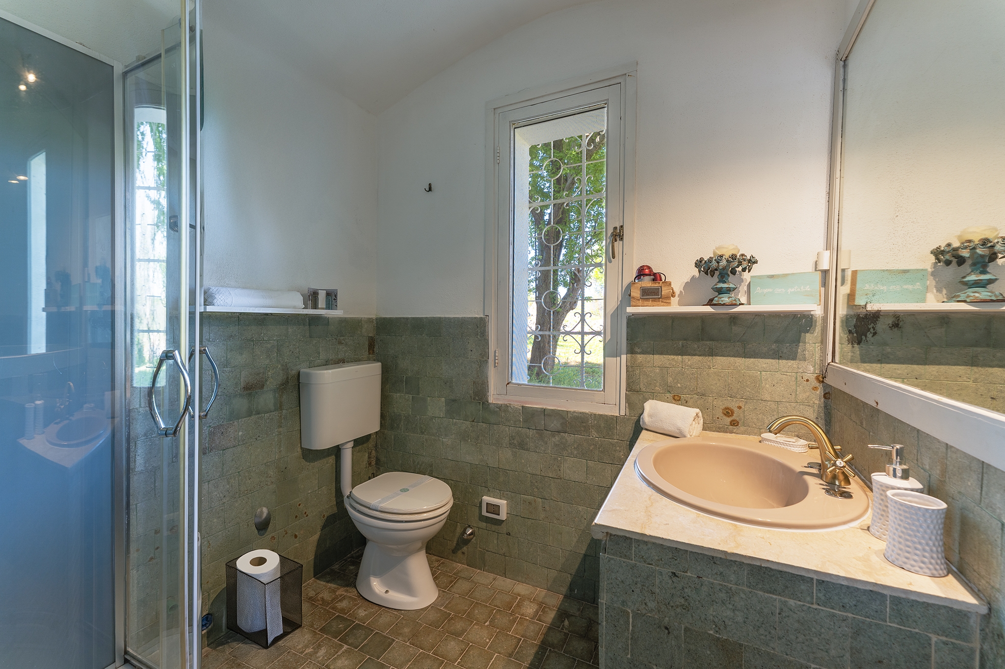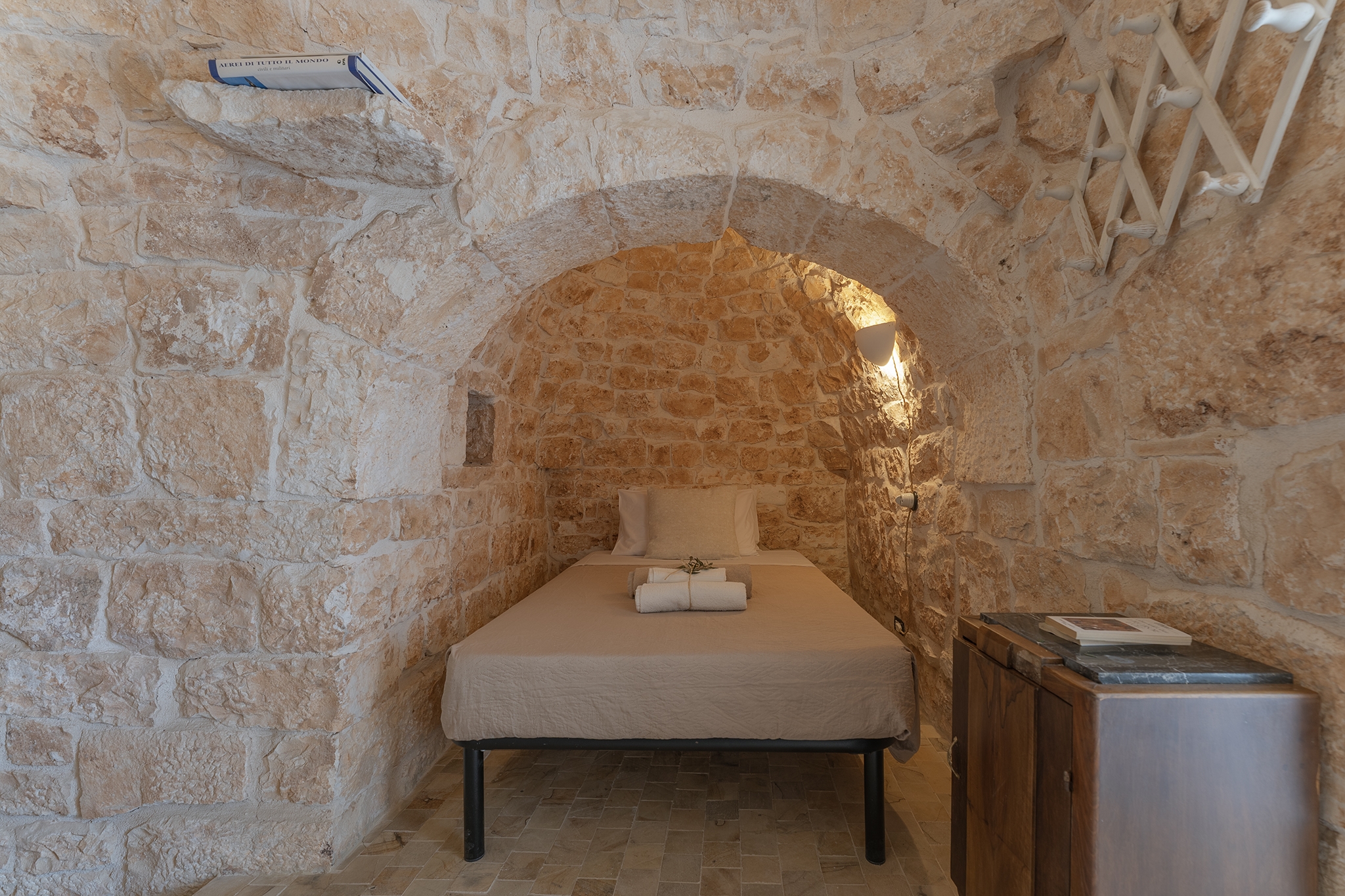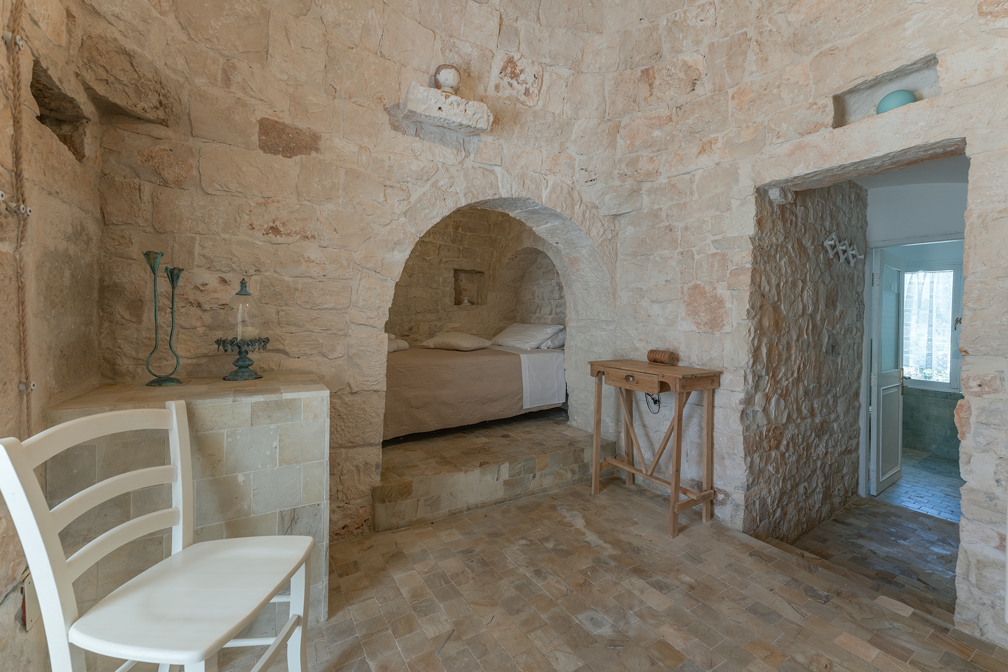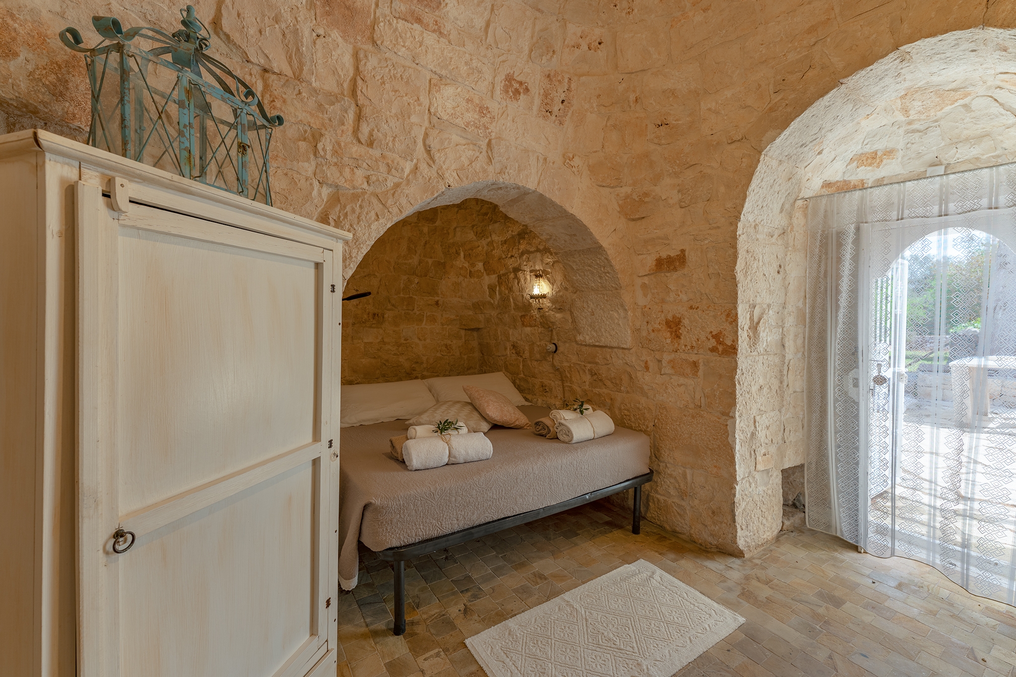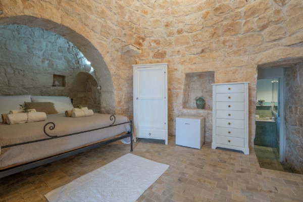 TRULLO ULIVO: ambiente indipendente con pietra a vista originale di fine ‘800, con le sue due alcove può ospitare 3 persone in quanto dotato di 1 letto matrimoniale e 1 ad una piazza e mezza, con bagno privato con le sue tipiche cementine turchesi e doccia idromassaggio